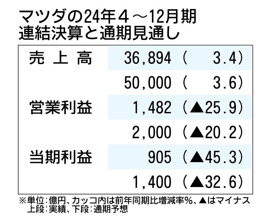 マツダが2月7日発表した2024年4~12月期連結業績は、最終利益が前年同期比45%減の906億円と大幅減益となった。為替差益や新車販売増などの増益効果があったものの、米国などでの販売奨励金(インセンティブ)の増加や原材料・物流コストの上昇が響いた。一方、通期の業績見通しは前回予想を据え置いた。