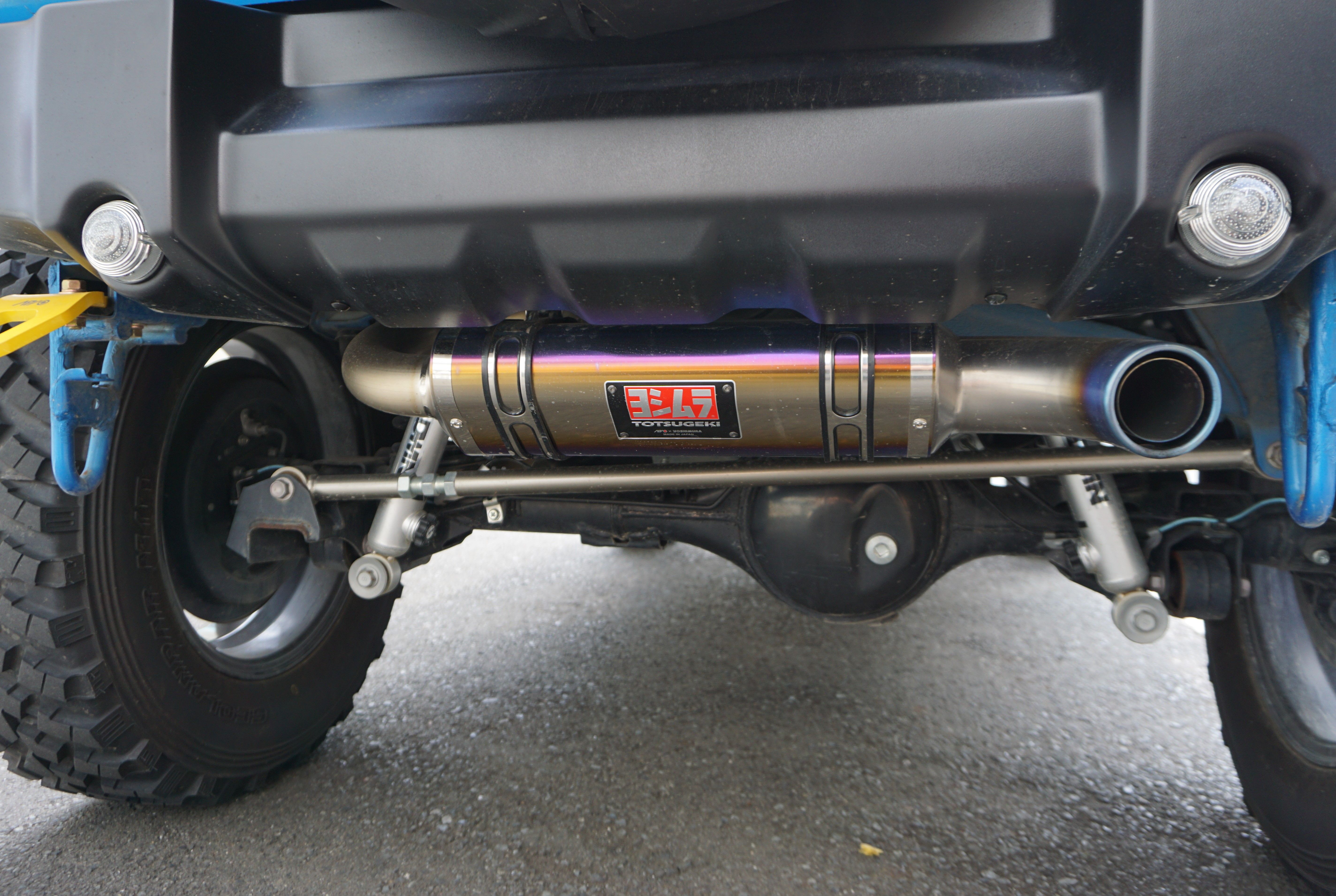 また、トツゲキシリーズとして定番のマフラー「静香御前」シリーズや、2輪業界で世界的に有名な「ヨシムラ」とコラボレーションしたチタンマフラーも、根強い人気を誇っている。特に高品質のチタンマフラーは、高価格にもかかわらずJB23用は1000本以上の装着されている。JB64と74用も問い合わせが増えており、新たにチタン素材に焼き入れをしない”チタングレー”を新作として追加した。「顧客には多趣味なライダーが多い」と言う河野社長は、チタンマフラーのつなぎ部分にあえてバイク用部品を使うなど、性能だけではない遊び心も取り入れている。