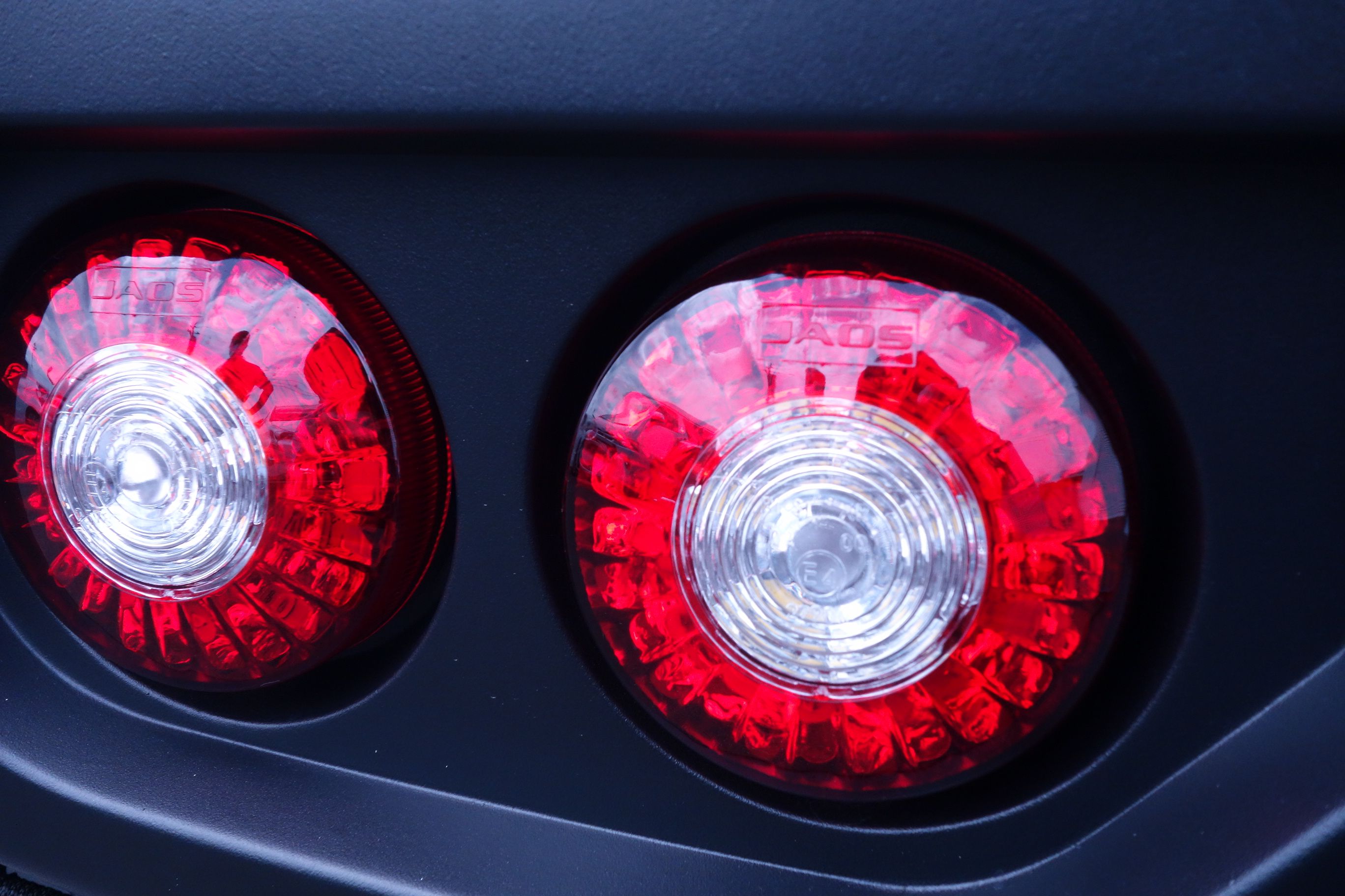 リアスポーツカウルは純正のランプユニットをオリジナルの丸2灯に変更。もちろんEマーク認証を取得しており、車検対応商品とした。ライトには「JAOS」ロゴが入り、細かなところまで同社のこだわりが詰まっている。さらに「バトルズ」ブランドで発売しているリフトアップセットも欠かせない人気商品だ。日常のほとんどを占めるオンロードでの乗り心地と安定性、そしてジムニー用としてリリースされているオフロードタイヤを過不足なく装着できるフェンダークリアランスを確保した40ミリアップの設定となっている。これはバトルズのコンセプト「ノーマル+α」で安心して楽しめる商品を提供したいとの思いからだ。
