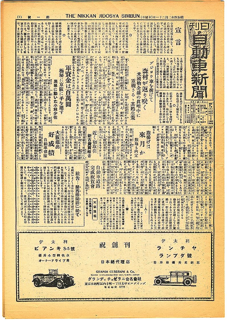 日刊自動車新聞が創刊された当時は、日本の自動車保有台数がわずか8万台あまり。米国のフォード・モーターやゼネラル・モーターズが日本に組み立て拠点を相次いで構えるなど、外国車全盛の時代だった。創刊号の宣言文には、「自動車は世界文化の第一線に立つ花形役者であり、世界新文化のオーガナイザーとして、さらに極めて重要な役割を演じつつある」と、今に続く自動車の時代の到来を予見する文言が並ぶ。さらに、欧米には自動車業界専門の日刊紙がすでに複数存在し、確固とした発行部数と信認を得ているとし、日刊自動車新聞が日本の自動車産業発展の道標となる決意を表明している。