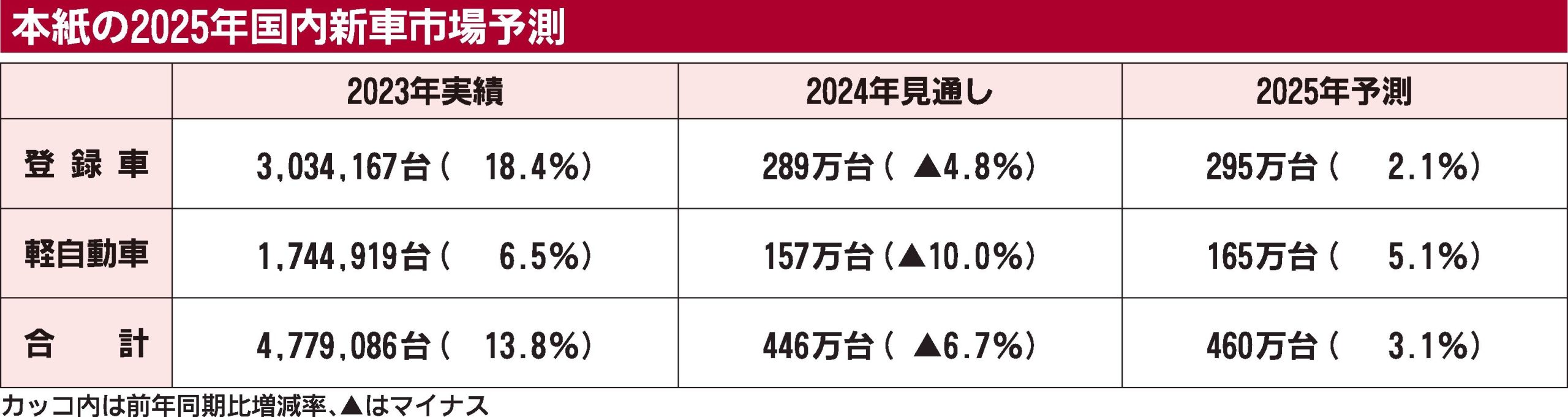 日刊自動車新聞は、2025年の国内新車市場を約460万台(24年見通し比約3.1%増)と予測した。ダイハツ工業やトヨタ自動車の販売が増え、2年ぶりに前年実績を超えると見立てた。エネルギーや物価高が続く中、個人消費の先行きは予断を許さないが...