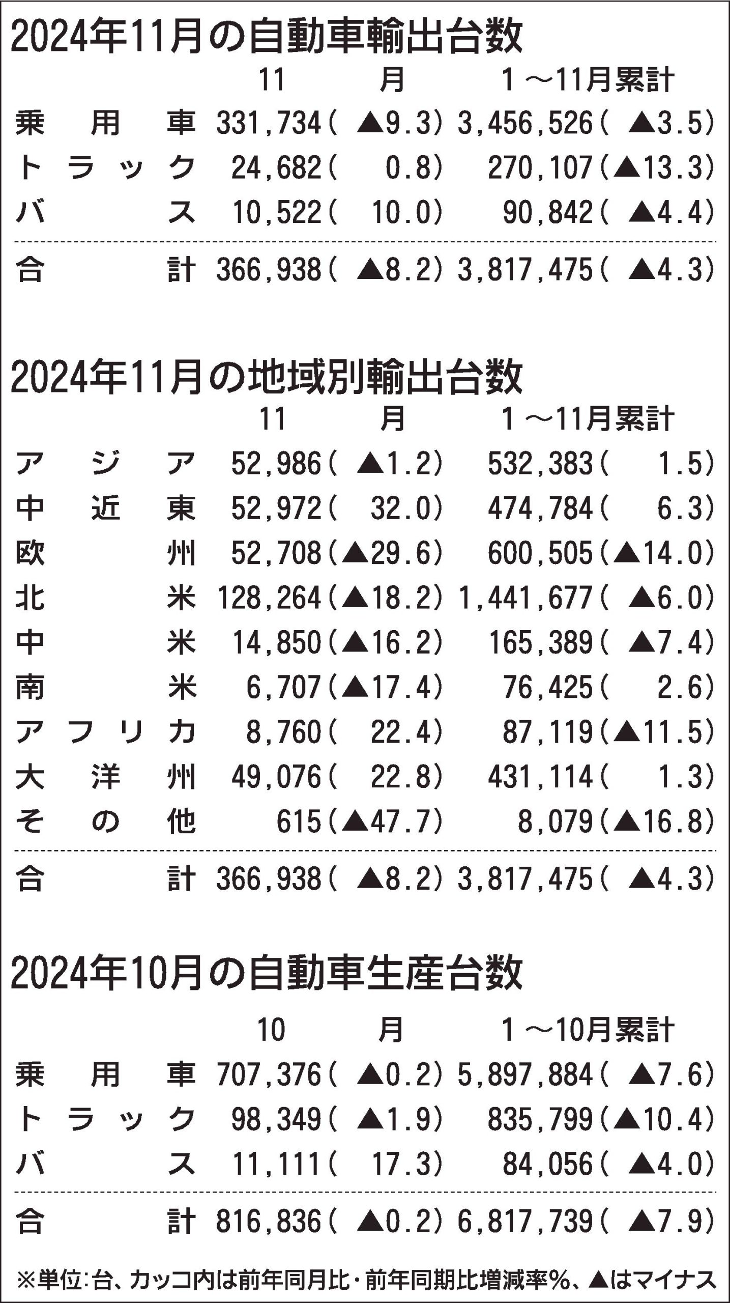 同日発表した10月の生産台数は、同0.2%減の81万6836台で3カ月連続のマイナス。バスは同17.3%増、乗用車(同0.2%減)とトラック(同1.9%減)は微減にとどまった。