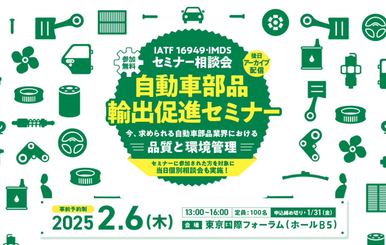 同セミナーはIATF 16949認証の取得、IMDSに関する内容とし、自動車部品の輸出を検討し、新たに認証を目指す方に向けて、IATF認証の概要やコアツール、グローバルな自動車産業における化学物質管理について、現状の自動車部品産業の状況を交えながら分かりやすく解説します。