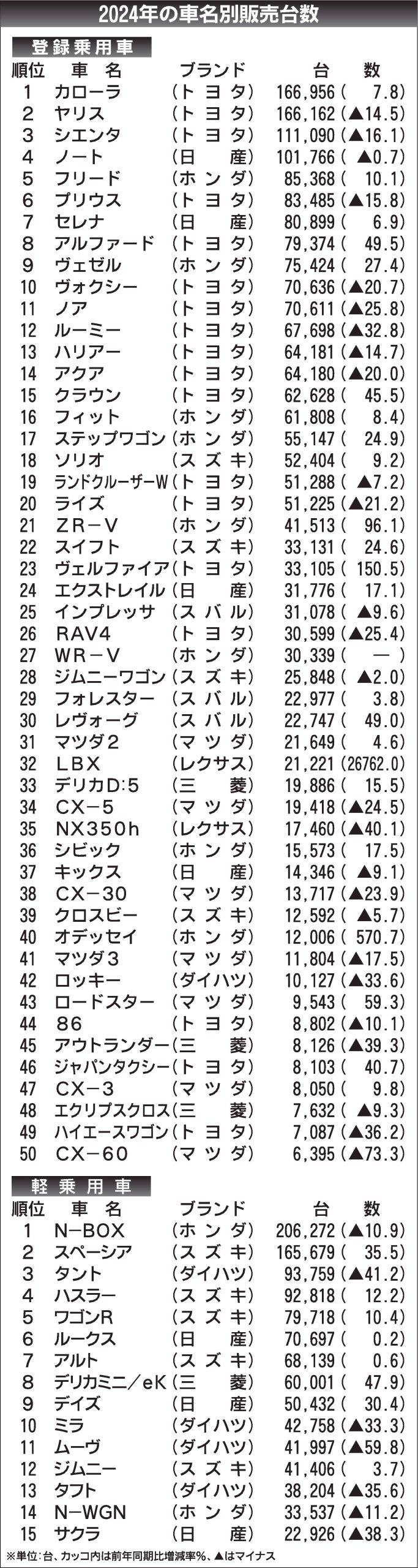 2024年の新車販売ランキング、登録車トップはカローラ 多彩な車型で17年ぶり首位 総合ではN-BOX