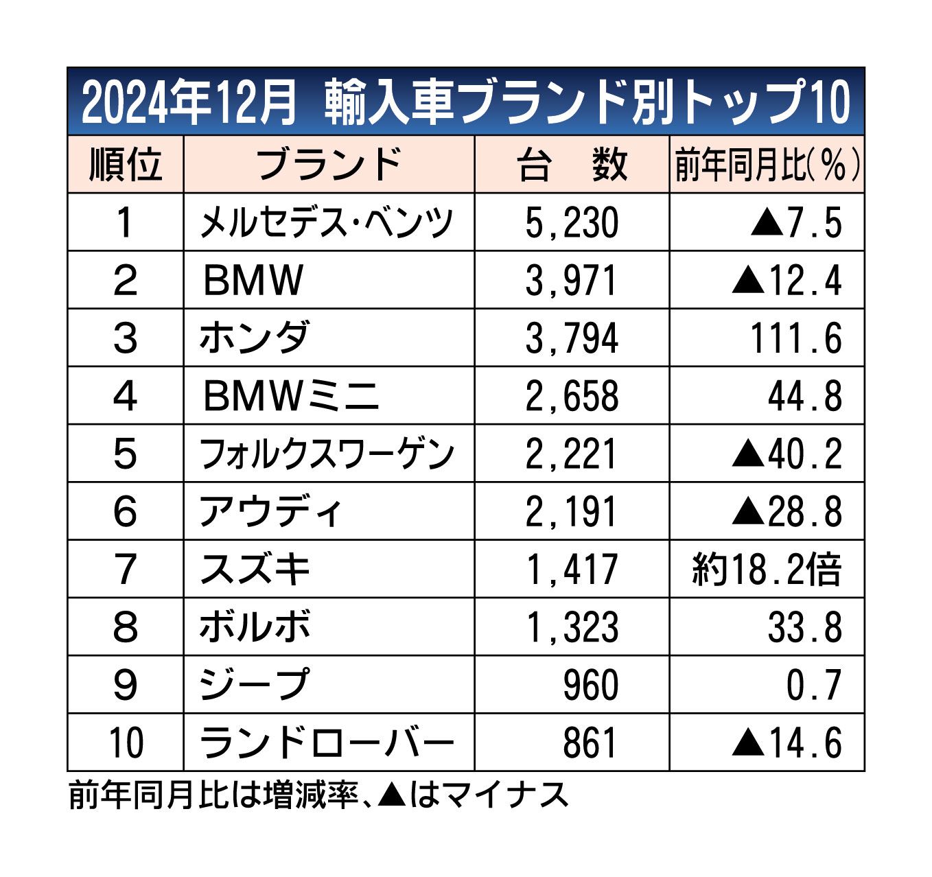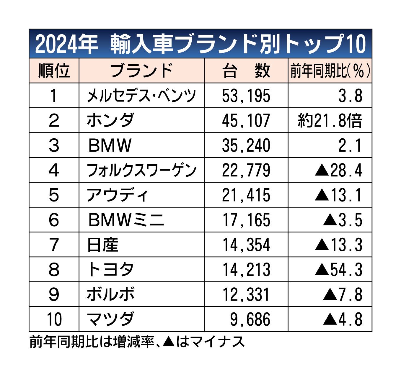 乗用車のブランド別ではメルセデス・ベンツ(MB)が10年連続で首位を維持。MBとBMWは前年を上回ったが、商品の供給面で滞りがあったフォルクスワーゲン(VW)が前年より3割減少した。モデル別ではBMWミニの「ミニ」が9年連続で首位を守った。