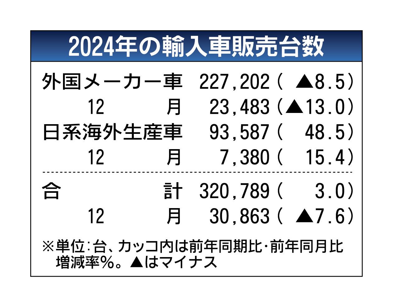 2024年の外国メーカー車の新規登録台数が2年ぶりの前年割れとなった。日本自動車輸入組合(JAIA、ゲルティンガー剛理事長)が9日公表した統計では、前年比8.5%減の22万7202台だった。中東情勢の影響で海上輸送が長期化したほか、一部の有力ブランドが生産拠点の事情などで日本への供給不足が続いたことなども影響した。一方、輸入電気自動車(EV)は6年連続のプラスだった。