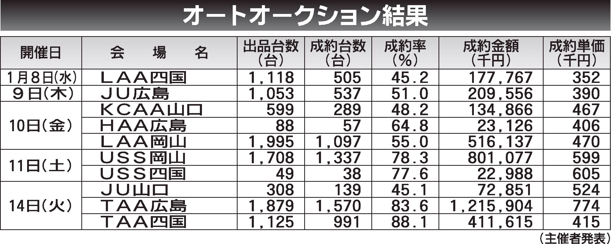 〈オートオークション結果〉中四国地区 2025/1/8~14
