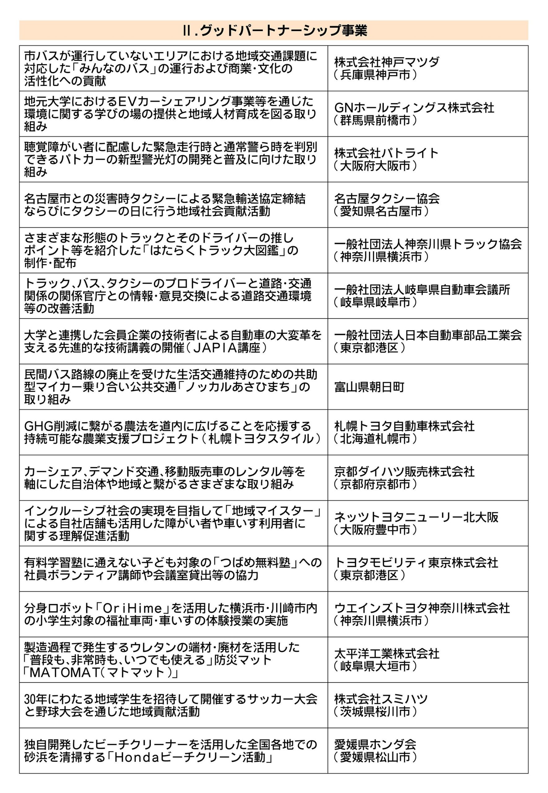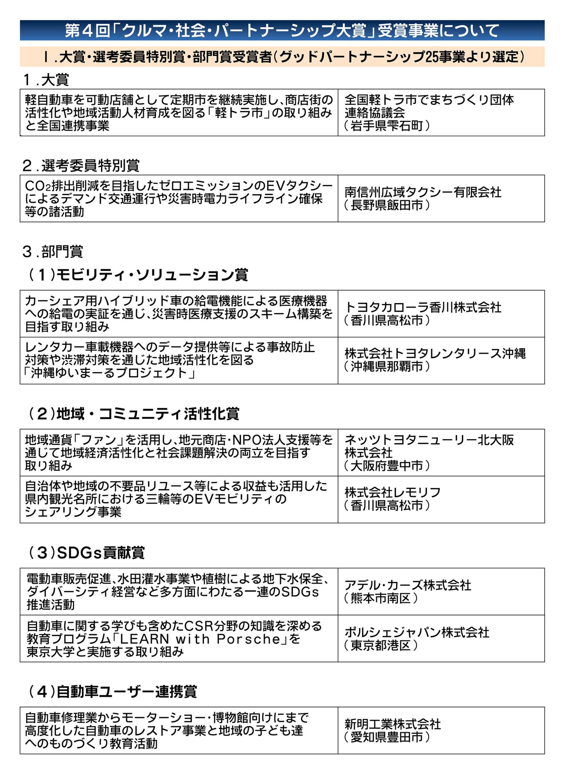 CSP大賞は、自動車業界で働く550万人とユーザーのさまざまな貢献に感謝を伝えるとともに、活動の広がりを促進する表彰事業として2021年に創設。日刊自動車新聞社と毎年共催している。選考委員会(委員長=鎌田実東京大学名誉教授・日本自動車研究所所長)により25件の「グッドパートナーシップ事業」を選定し、その中から大賞や部門賞を決定した。