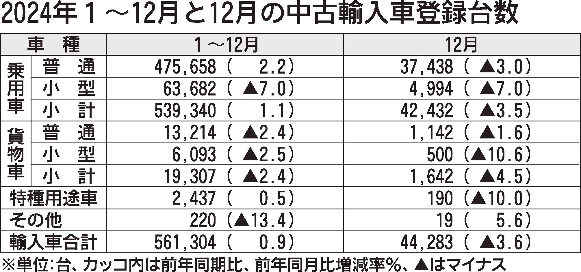 日本自動車輸入組合(JAIA、ゲルティンガー剛理事長)が16日発表した2024年の中古輸入車登録台数は前年比0.9%増の56万1304台だった。一定の需要があった乗用車がけん引し、小幅だったものの2年連続のプラスだった。 車種別では乗用車...