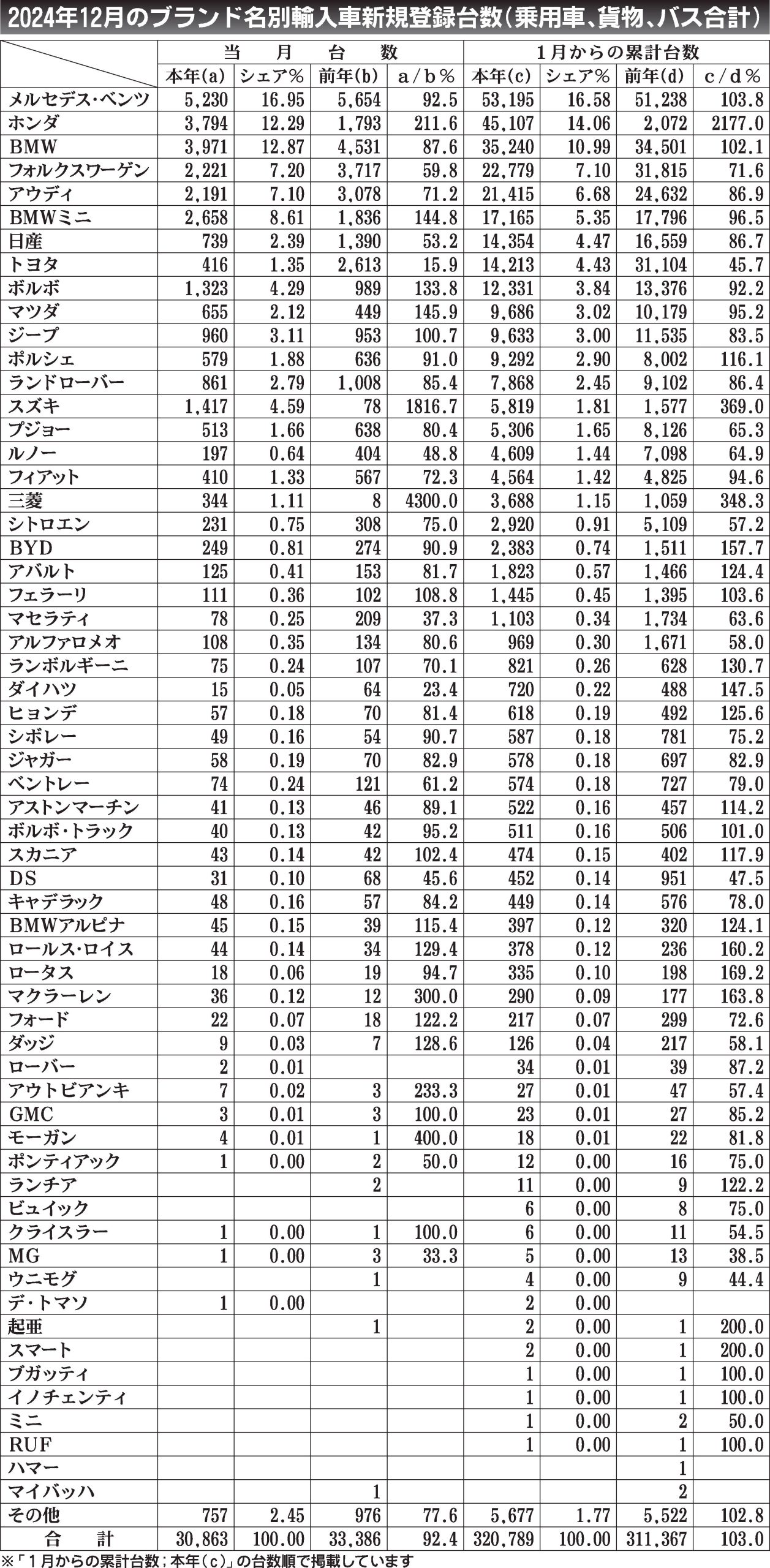 〈2024年12月のブランド名別輸入車新規登録台数(乗用車、貨物、バス合計)〉