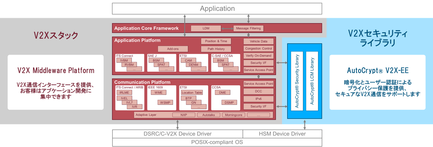 また従来は顧客が別途調達していたセキュアなV2X通信を実現するためのソフトウェアについても、サードパーティ製のV2XセキュリティライブラリをV2X Middleware Platformと合わせてワンストップで提供可能。