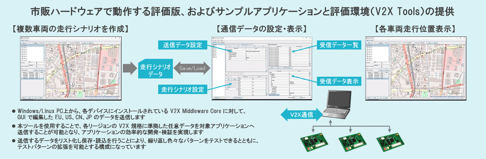 またV2X Toolsは、PC上から、各デバイスにインストールされているV2X Middleware Core に対し、GUIで編集したデータを送信。各リージョンのV2X規格に準拠した任意データを対象アプリケーションへ送信可能であり、アプリケーションの効率的な開発、検証を実現する。送信するデータをリスト化し保存/読込を行うことにより、繰り返し色々なパターンをテストできるとともに、テストパターンの拡張を可能とする構成になっている。