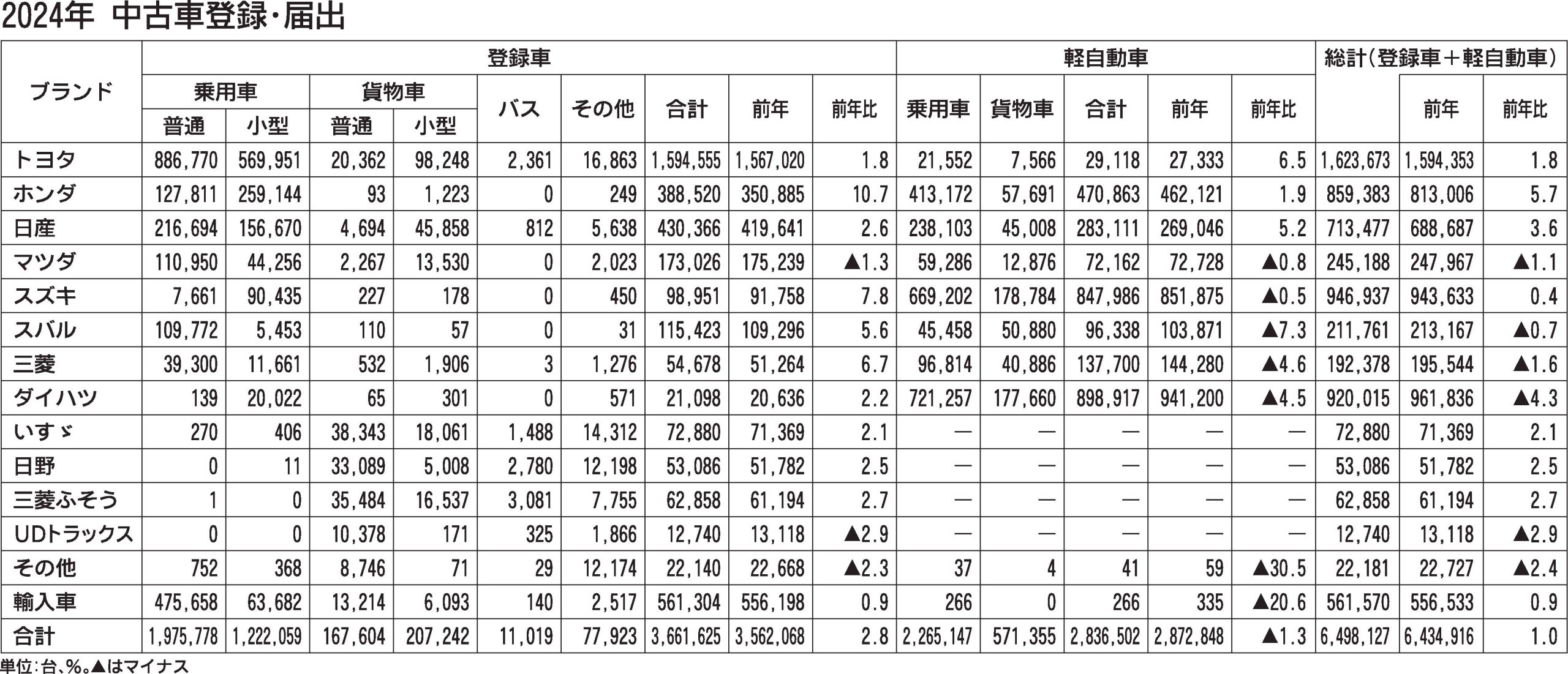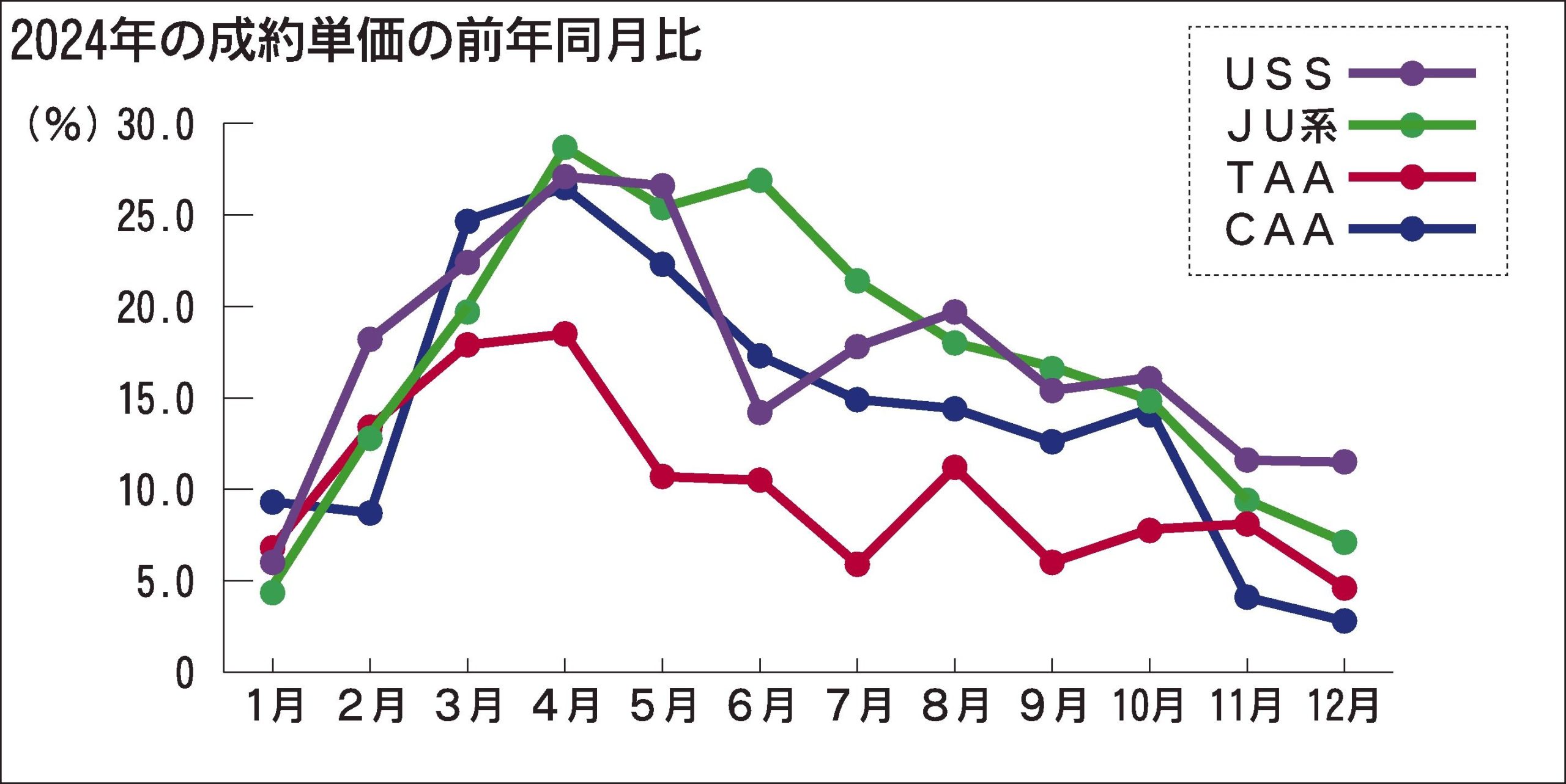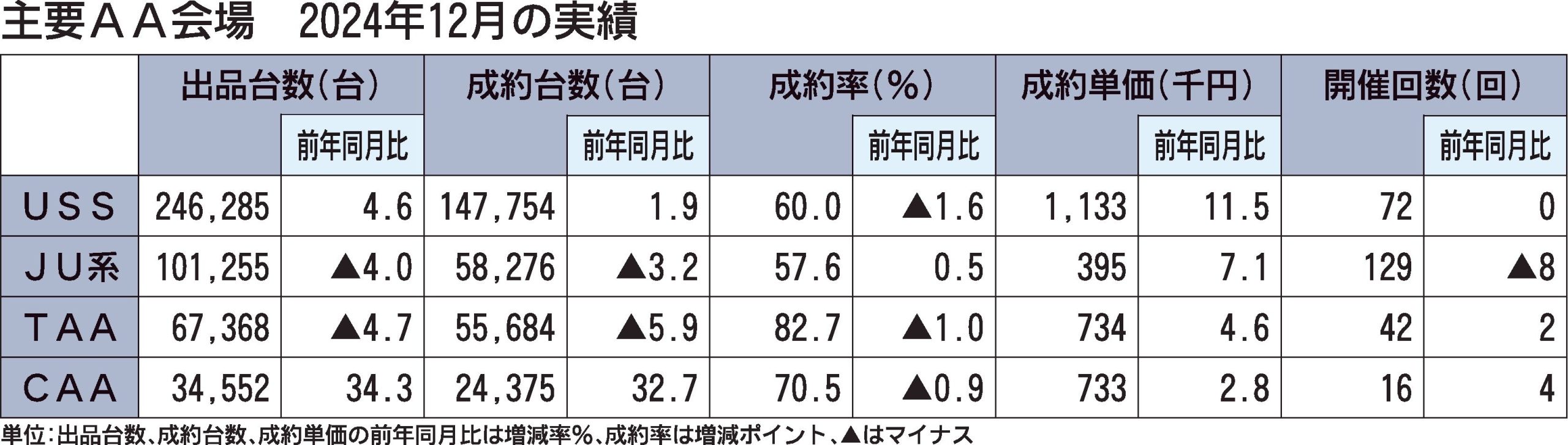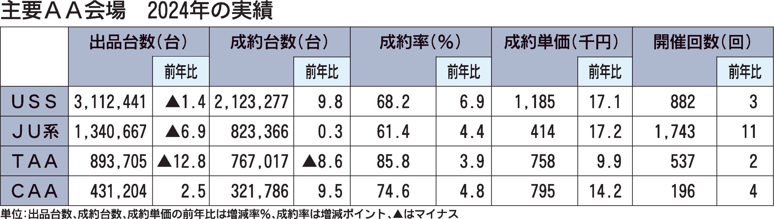 中古車オークション(AA)の主要4事業者が発表した2024年実績は、すべての事業者で平均成約単価が23年実績を上回った。出品台数はシーエーエー(CAA、斉藤啓太社長、愛知県豊田市)を除く3事業者がマイナス。一部メーカーの新車の供給制約によ...