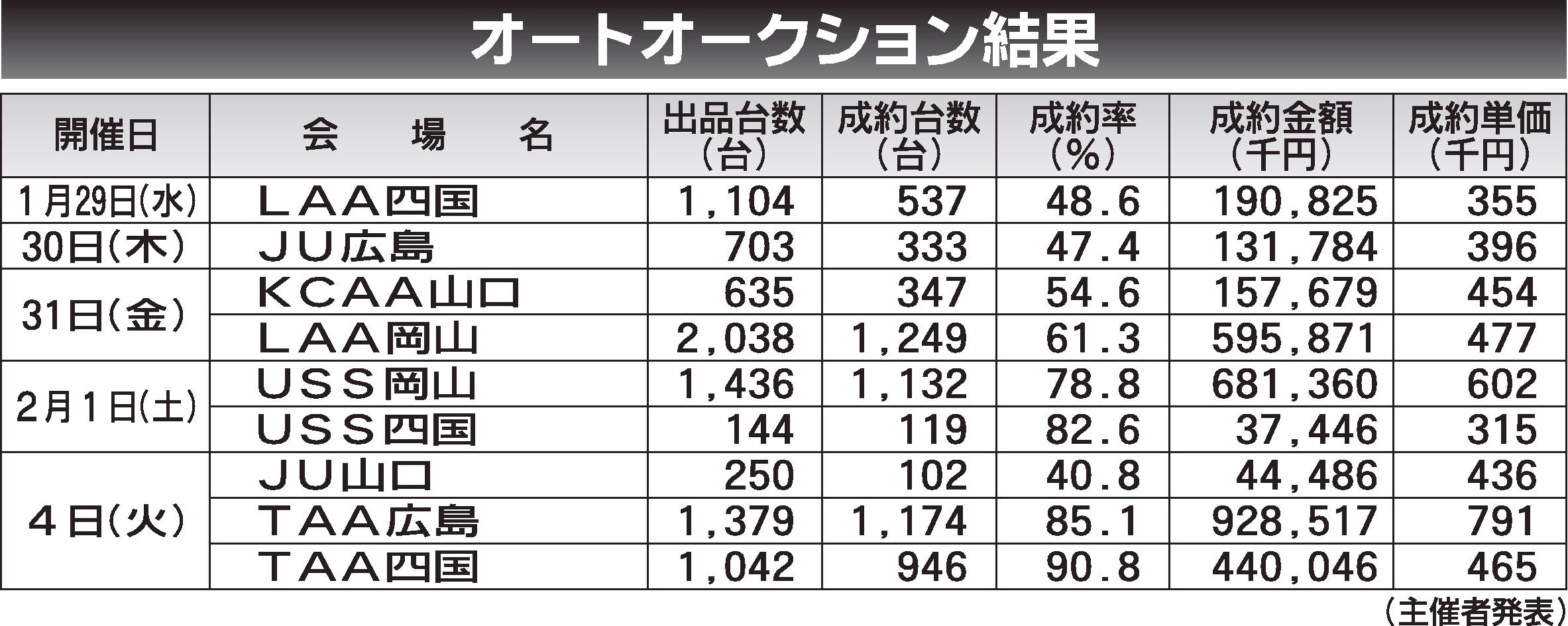 〈オートオークション結果〉中四国地区 2025/1/29~2/4