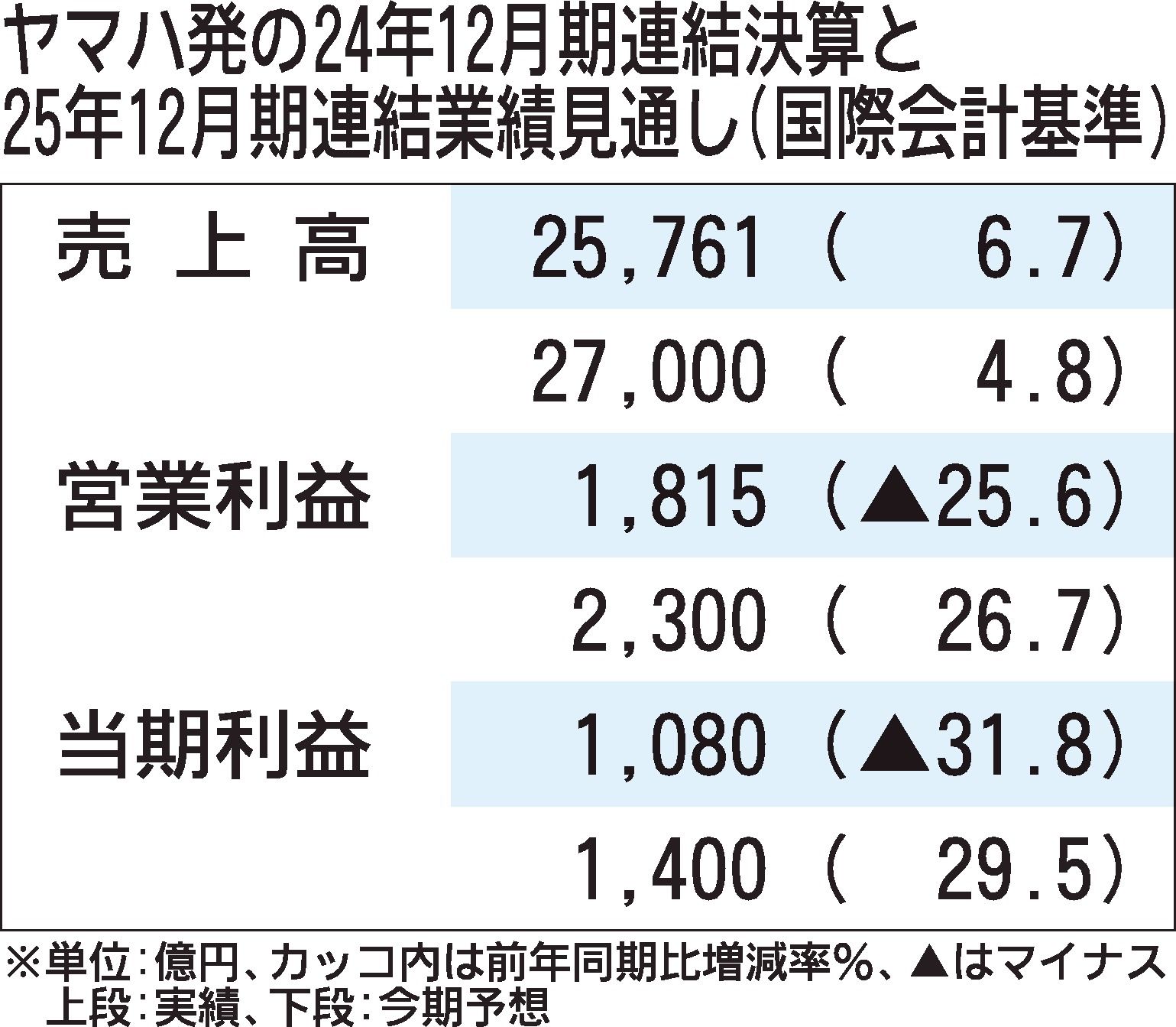 24年12月期の業績(国際会計基準)は売上収益が2兆5762億円(前年度比6.7%増)、営業利益が1815億円(同25.6%減)、当期純利益が1081億円(同31.8%減)だった。二輪車の出荷増や円安で増収となった一方、RV事業の不振などで減益となった。25年12月期の通期予想は売上収益2兆7千億円、営業利益2300億円、当期純利益1400億円。