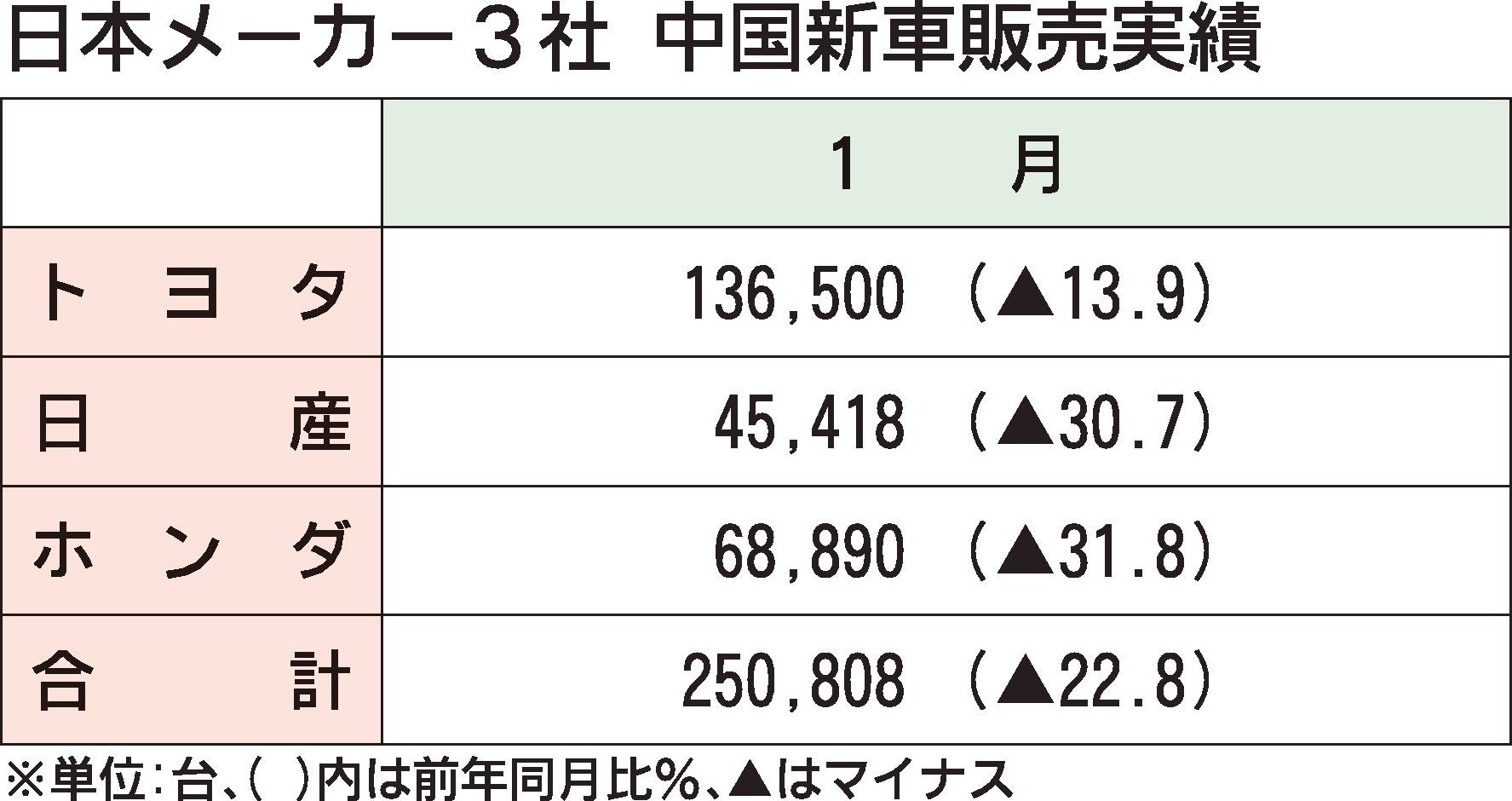 日本の自動車メーカー3社の1月の中国新車販売は25万808台と、前年同月と比べ22.8%減だった。前年実績割れは12カ月連続。「新エネルギー車(NEV)」を中心に値下げ競争が再燃の気配を見せる中、厳しい状況が続く。 トヨタ自動車は前年同月...