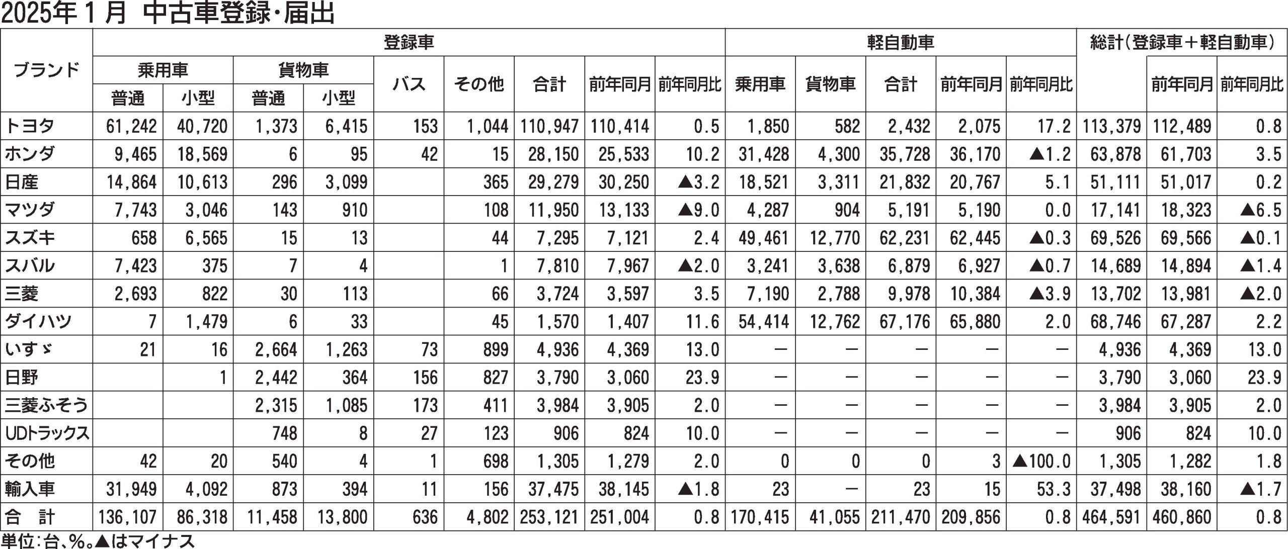 2025年1月の中古車登録・届け出台数、前年比0.8%増の46万4591台 3カ月ぶりプラス
