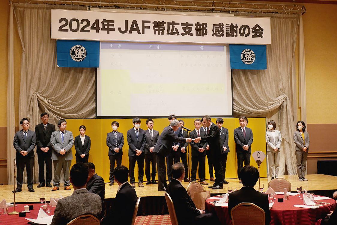 【帯広】日本自動車連盟(JAF)帯広支部(石原直樹支部長)は14日、帯広市内のホテルで「感謝の会」を開催。会員増加促進運動で優秀な成績を収めた自動車ディーラーやスタッフを表彰した。新規入会部門の個人部門では釧路トヨタの鈴木勇伸さんが1位に...