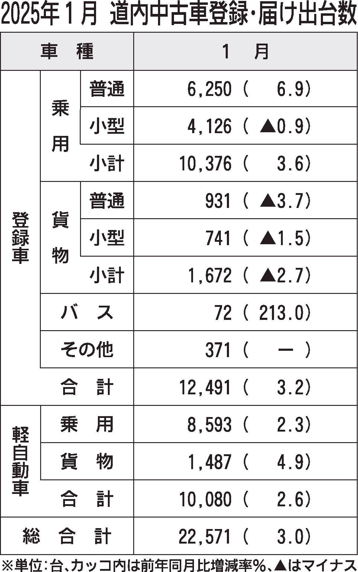 1月の道内中古車登録・届け出台数は、前年同月比3.0%増の2万2571台となり、3カ月ぶりに前年同月を超えた。登録車、軽自動車ともに増加した。 日本自動車販売協会連合会の中古車登録台数と全国軽自動車協会連合会の軽自動車中古車販売台数をまと...
