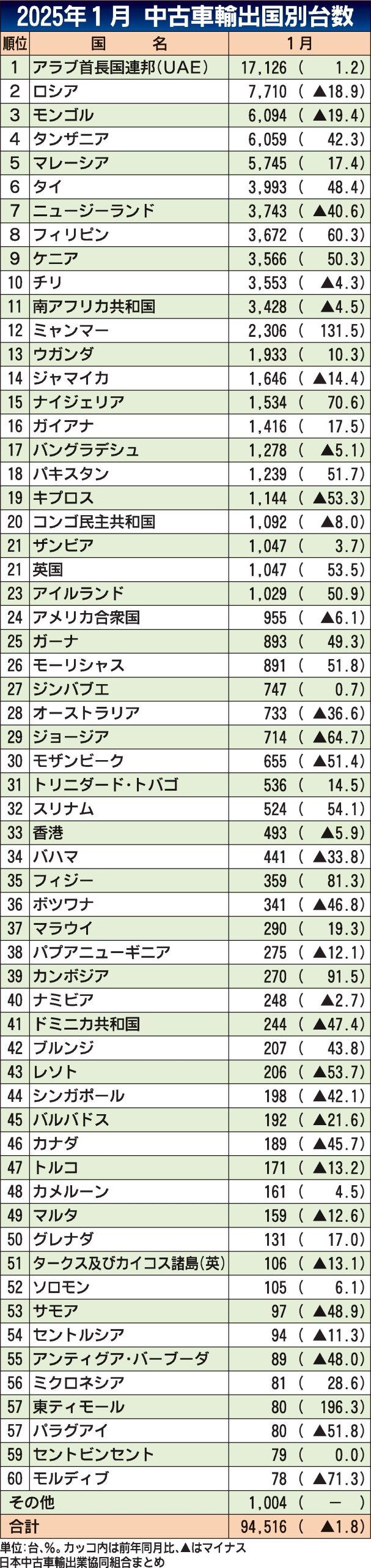 日本中古車輸出業協同組合(JUMVEA、佐藤博理事長)がまとめた2025年1月の中古車輸出台数(車両価格20万円以上)は、前年同月比1.8%減の9万4516台となり、2カ月連続で前年同月を下回った。日本車の海外需要は底堅いものの、国別で2...
