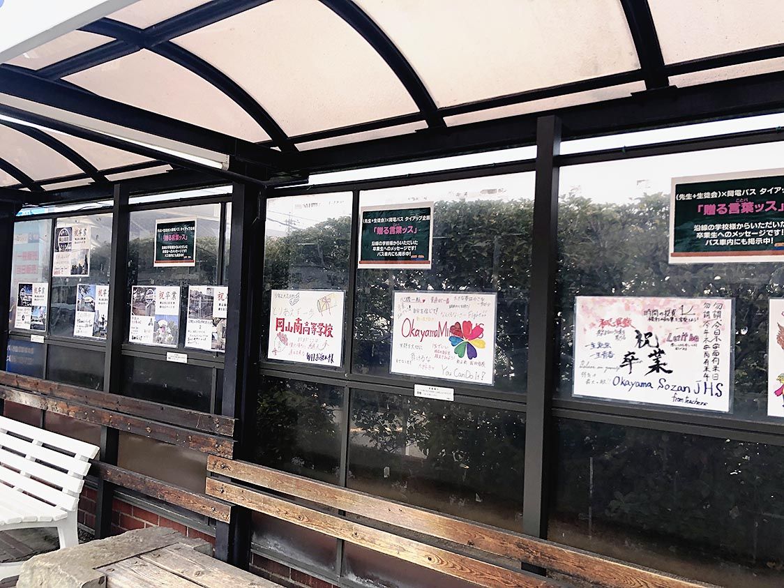 両備グループ、卒業生たちに「贈る言葉ッス」今年も実施 バス車内や停留所に寄せ書きポスター掲示