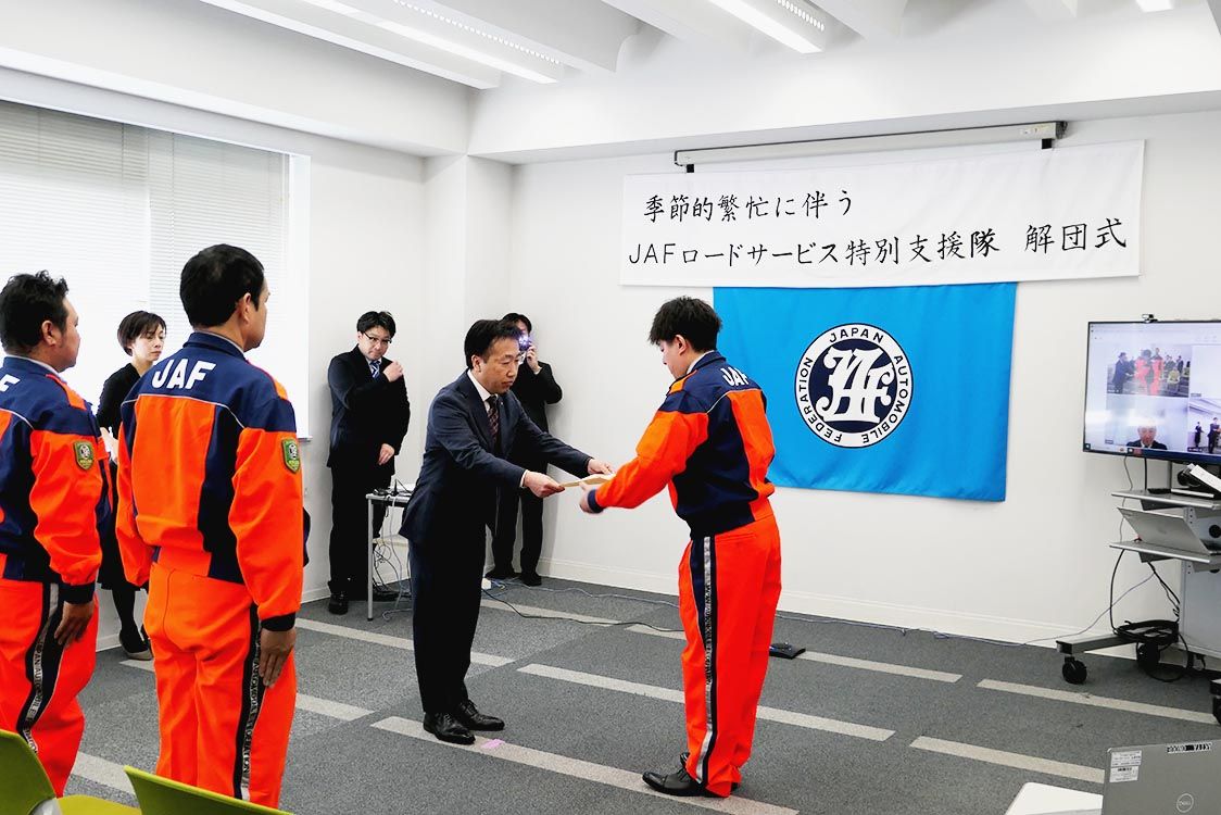 日本自動車連盟(JAF)札幌支部(横井隆支部長)は、冬季繁忙対策として道外支部から派遣された「特別支援隊」の解団式を開催した。2カ月の派遣期間で1206件の救援依頼に対応した。 積雪路面によるスタックやバッテリー上がりなどの救援依頼が増加...
