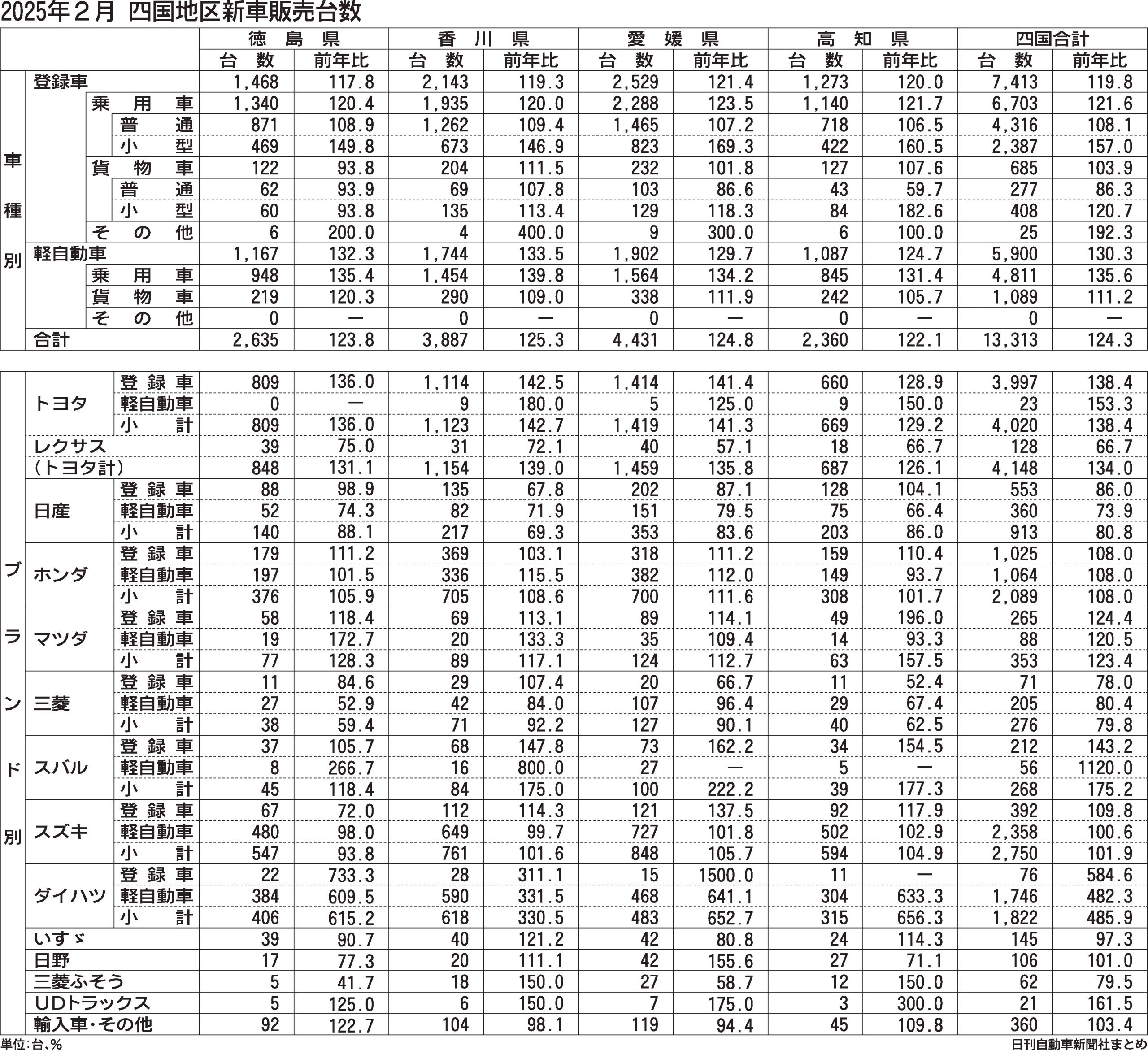 四国地区の2025年2月新車販売台数(登録車+軽自動車)は、前年同月比24.3%増の1万3313台と2カ月連続で大幅な伸びを示し、全国平均の伸び率(18.7%増)を5.6㌽上回った。トヨタやダイハツで継続生産車の法規対応が進むなど順調な登...