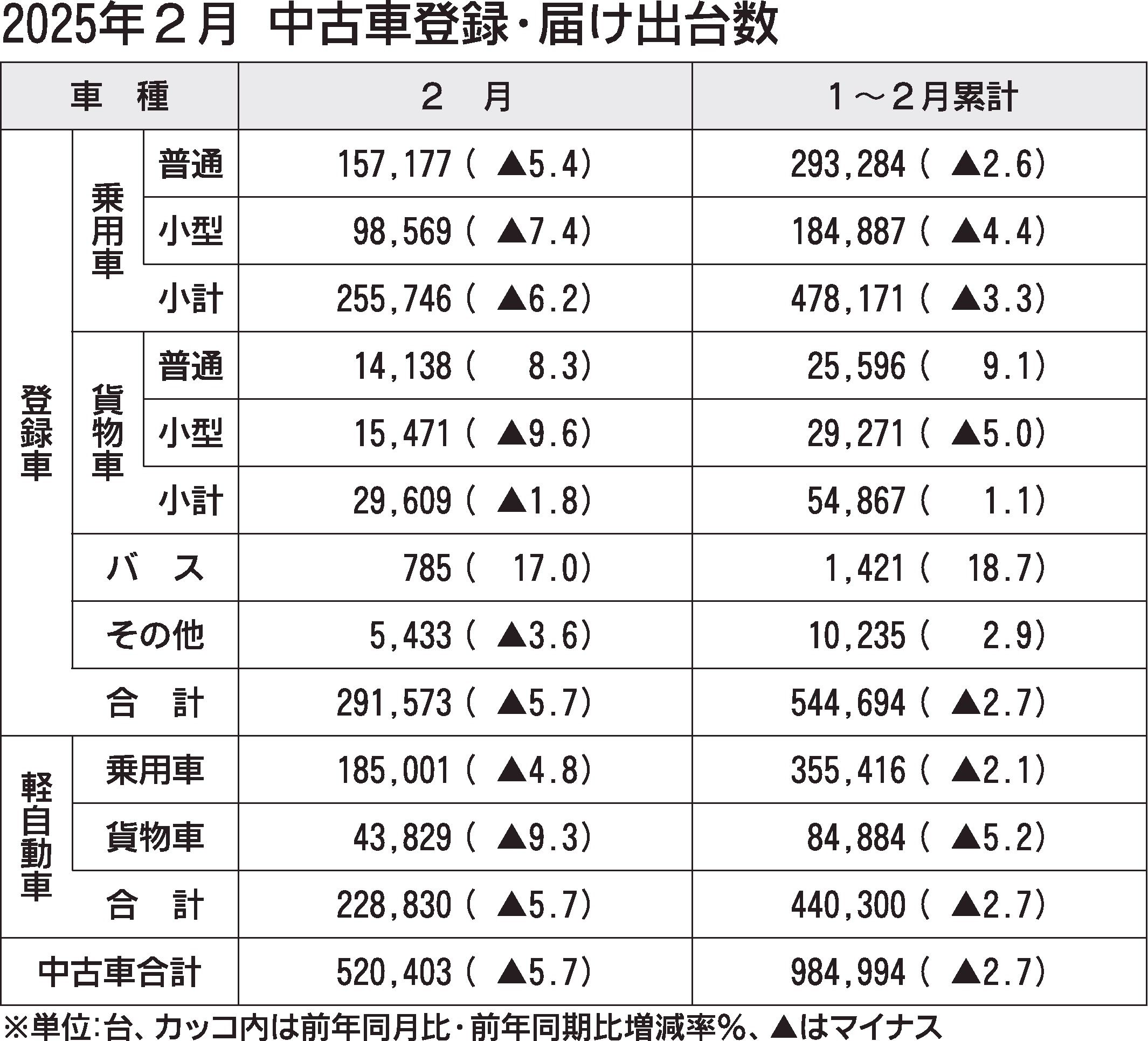 自販連が公表した25年2月の中古車登録台数は同5.7%減の29万1573台で2カ月ぶりに前年実績を割り込んだ。車種別では乗用車が同6.2%減の25万5746台で、貨物車が同1.8%減の2万9609台だった。