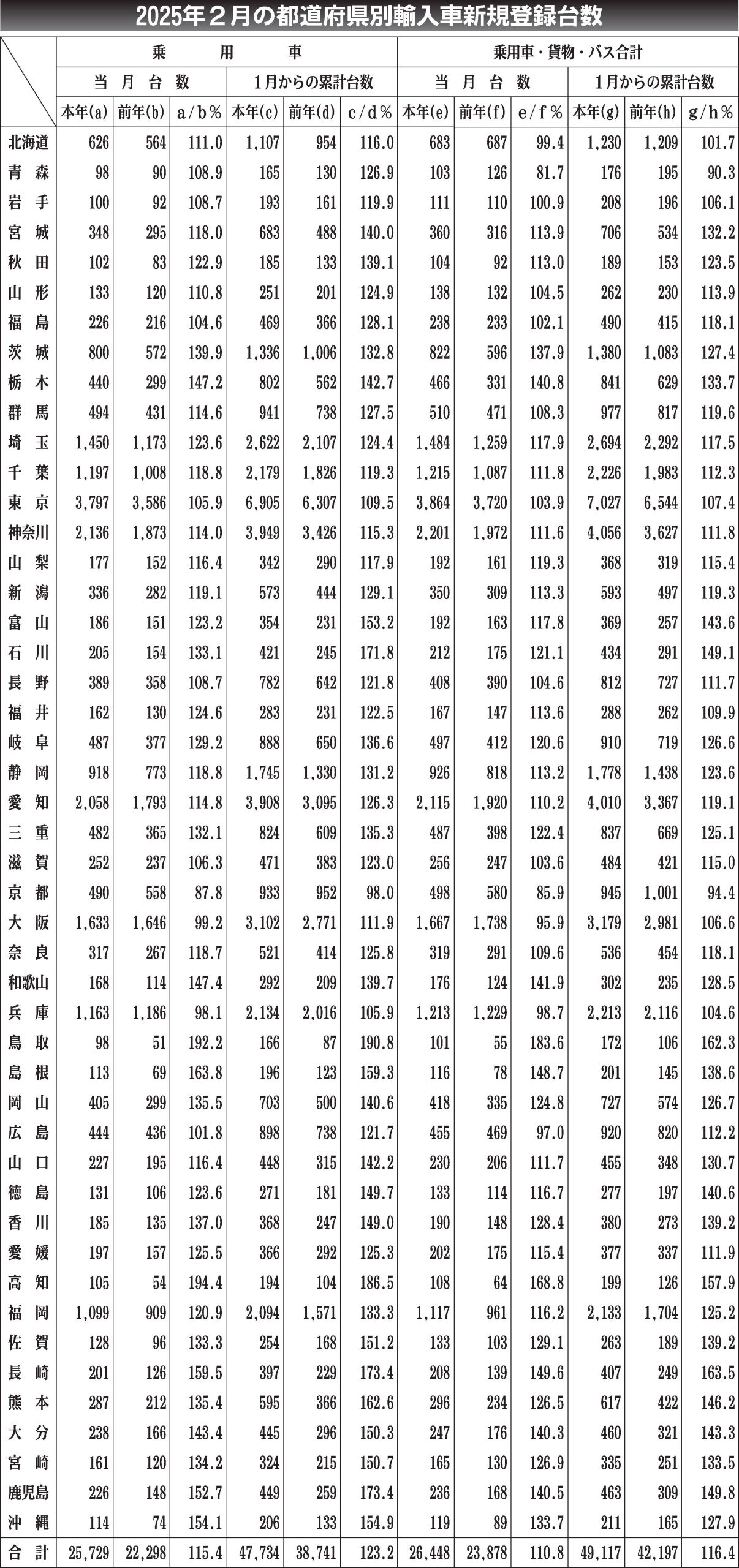 〈2025年2月の都道府県別輸入車新規登録台数〉