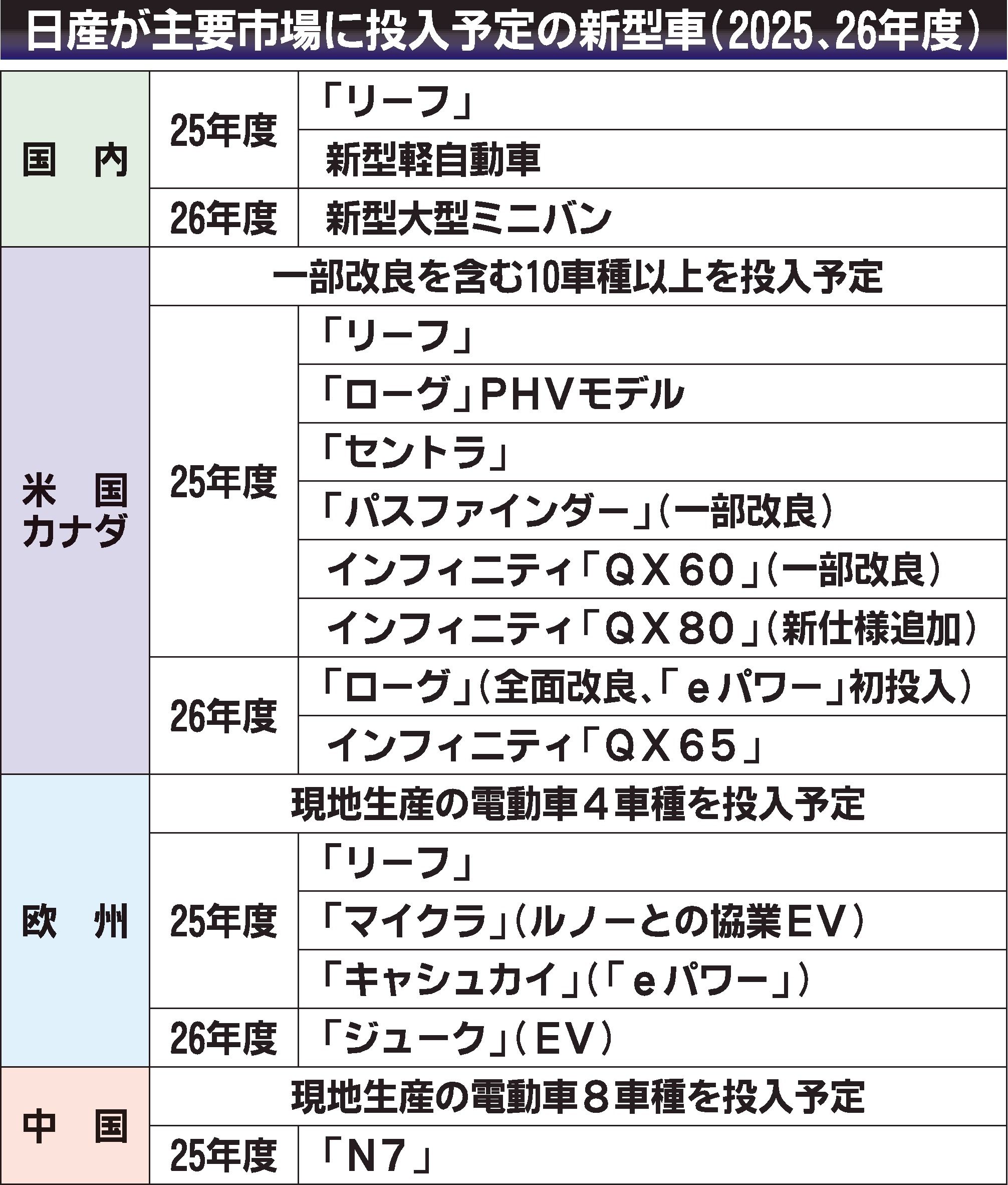 日産自動車は事業再生に向け、新型車の投入を急ぐ。電気自動車(EV)「リーフ」は2025年度に全面改良し、世界展開していく。北米では投入が遅れていたハイブリッド車(HV)を26年度に生産を始める新型「ローグ」に設定する。国内では新型軽自動車...
