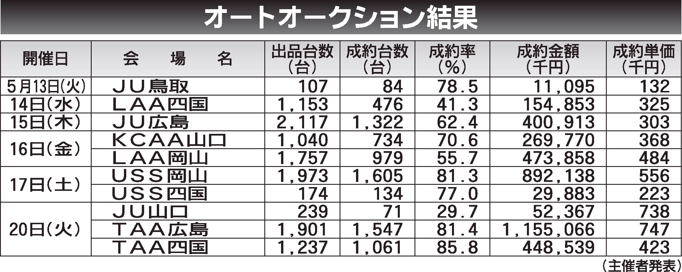 〈オートオークション結果〉中四国地区 2025/5/13~20