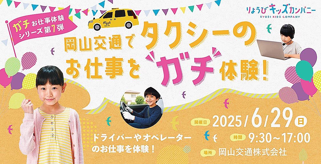 【岡山】両備グループ(小嶋光信グループ代表兼CEO)は、小学生向けの「ガチお仕事体験シリーズ第7弾」として、グループ企業の岡山交通でタクシーの仕事を体験できるイベントを、6月29日に実施する。 小学生向け職業体験イベントは、両備グループの若...