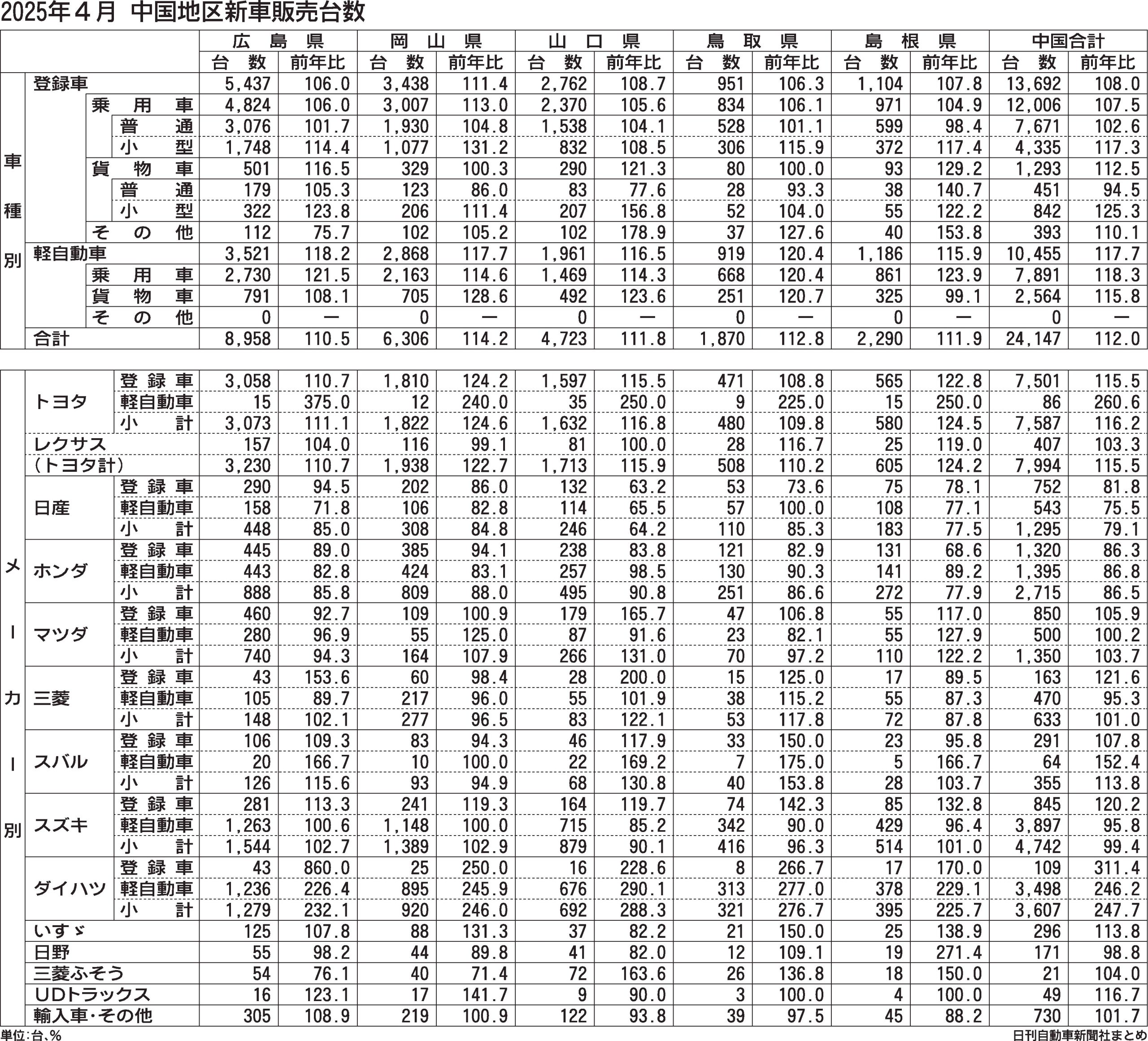 2025年4月の中国地区新車販売台数(登録車と軽自動車の合計)は、前年同月比12.0%増の2万4147台となった。4カ月連続で前年台数を上回り、中国5県すべてが前年台数を2ケタ上回るなど好調に推移した。このうち登録車の台数は同8.0%増の...