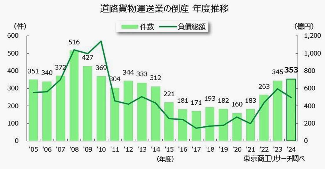 2024年度の運送事業者倒産 14年ぶり350件超 「人手不足」起因が急増 東京商工リサーチまとめ