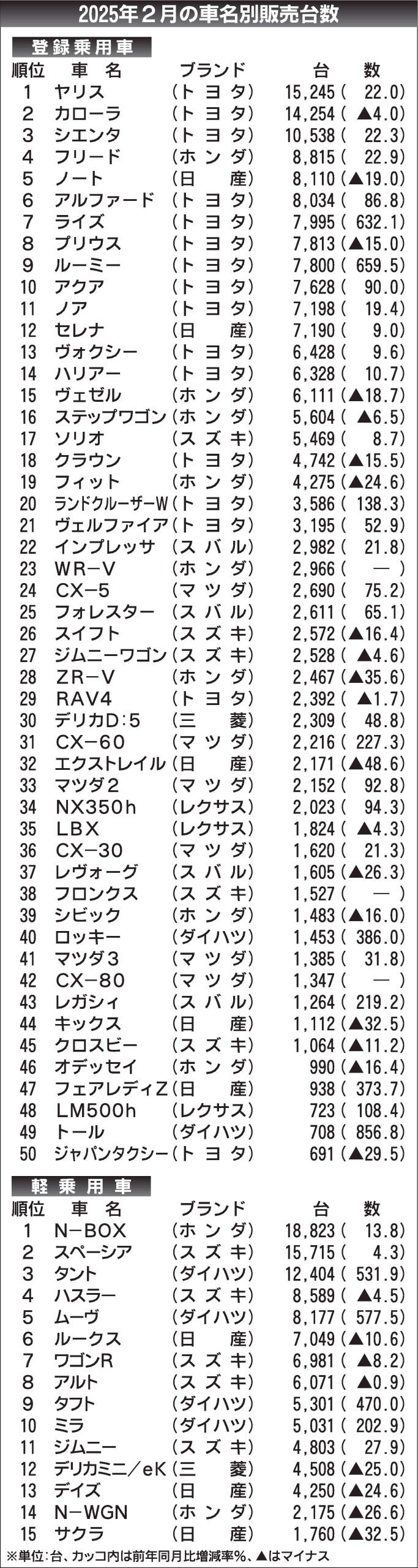 2025年2月の新車販売ランキング、スペーシアが2位浮上 N-BOXはトップ変わらず