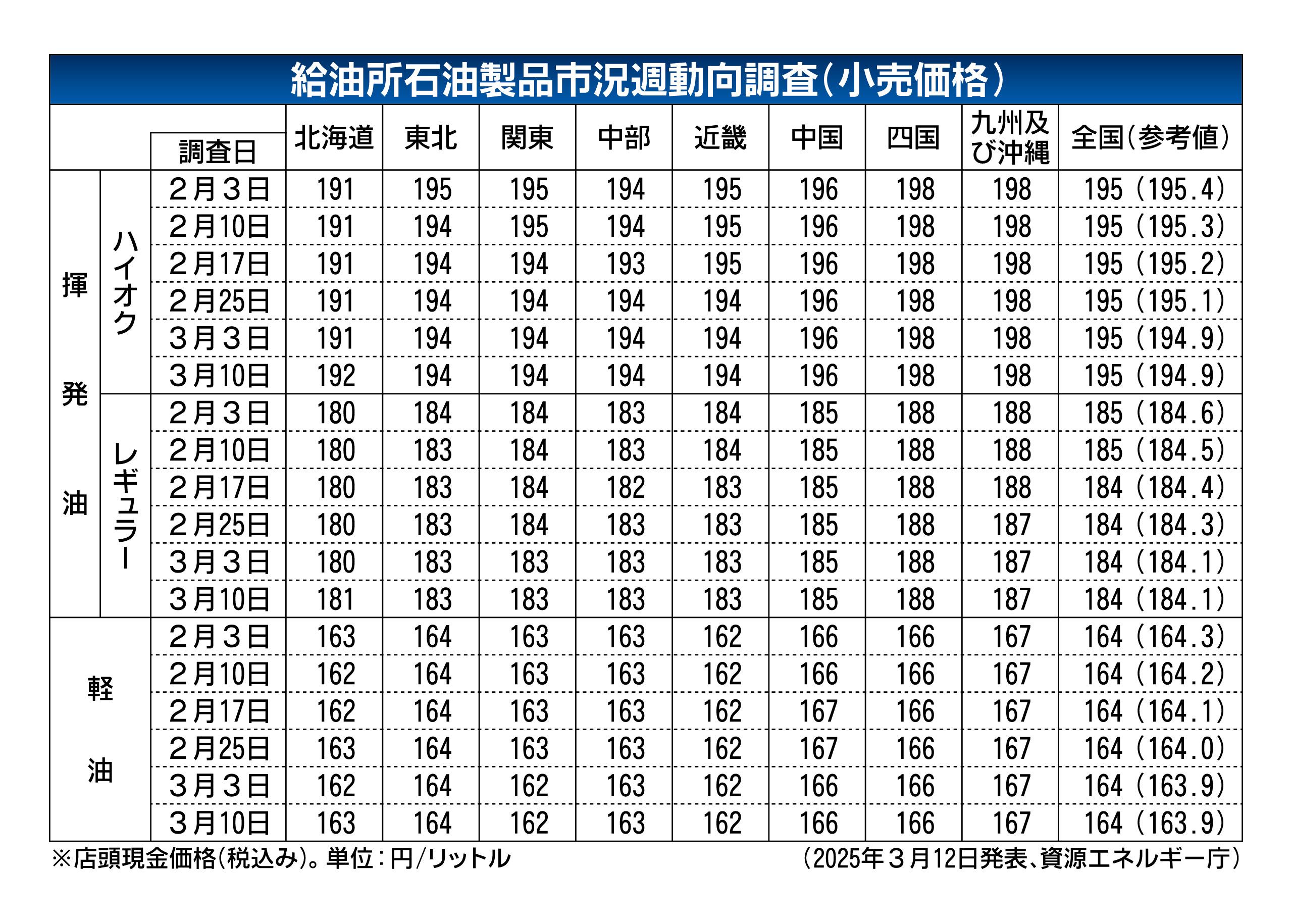〈給油所石油製品市況週動向調査(小売価格)〉2025/2/3~3/10