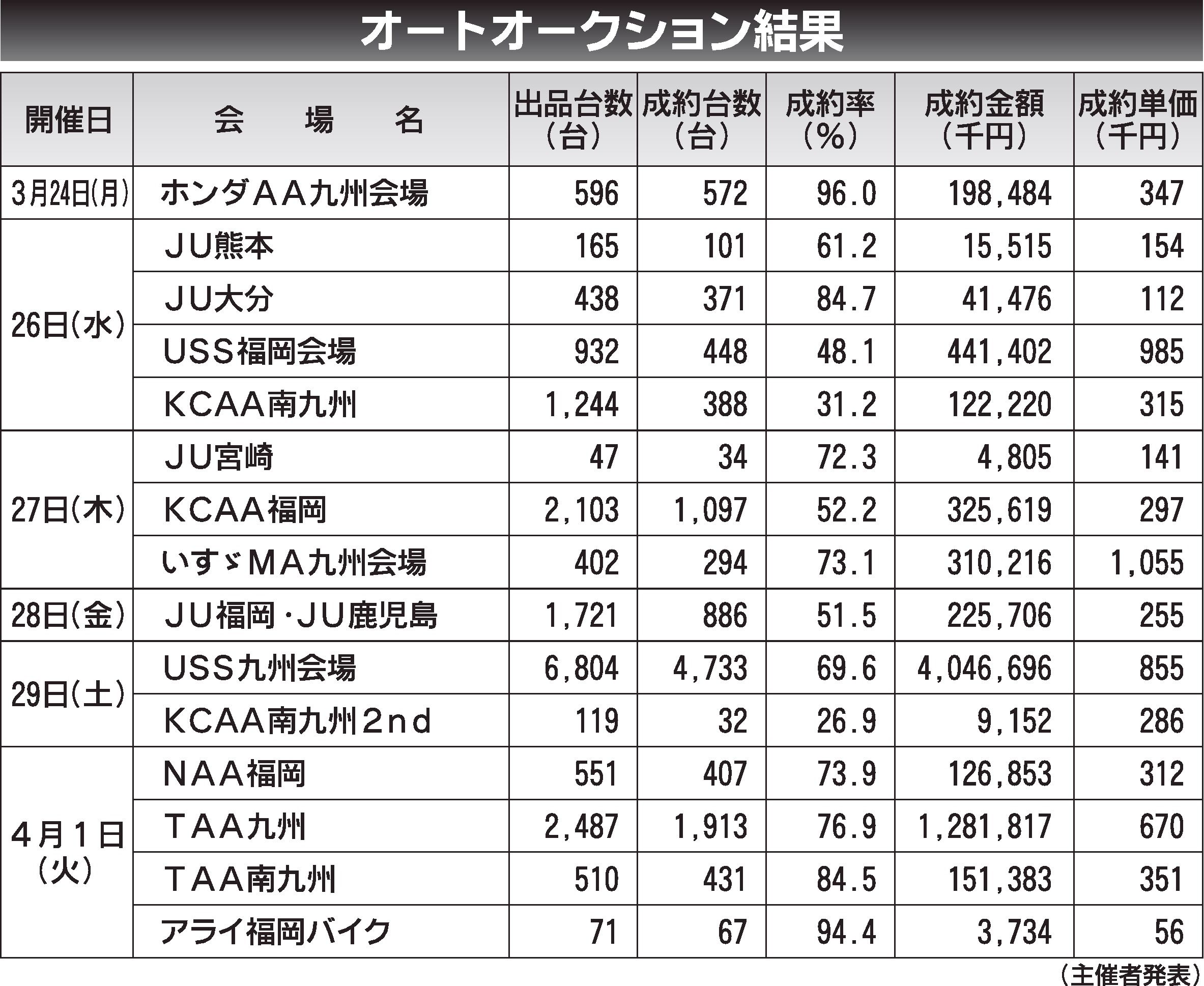 〈オートオークション結果〉九州地区 2025/3/24~4/1