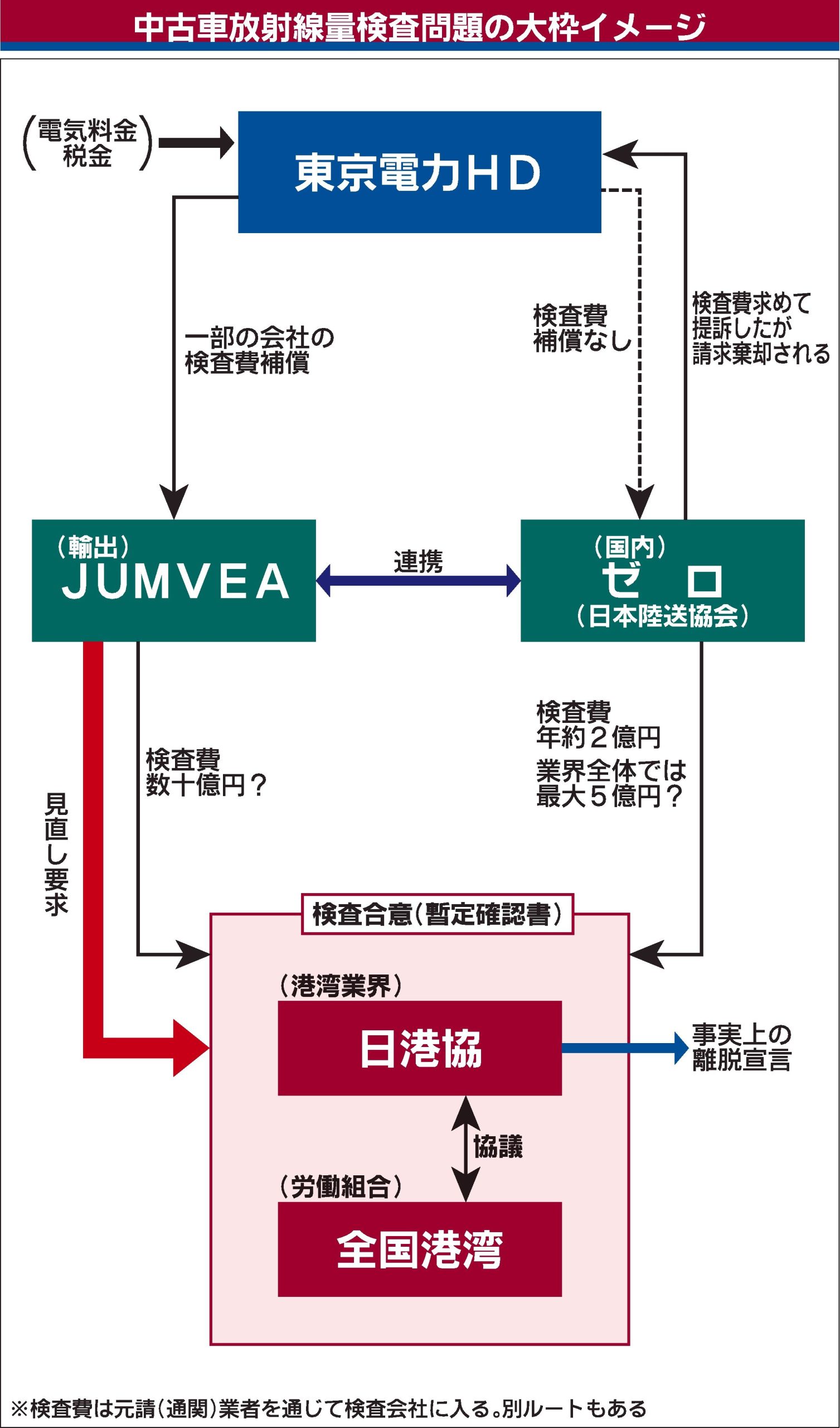東日本大震災に伴う福島第一原発事故の後、船積みする中古車の放射線量検査が今も続く問題で、東京電力ホールディングス(HD)は、検査費用の賠償を2025年7月から事実上、廃止する方針を関係者に伝えた。国土交通省と経済産業省が検査の廃止を事実上...