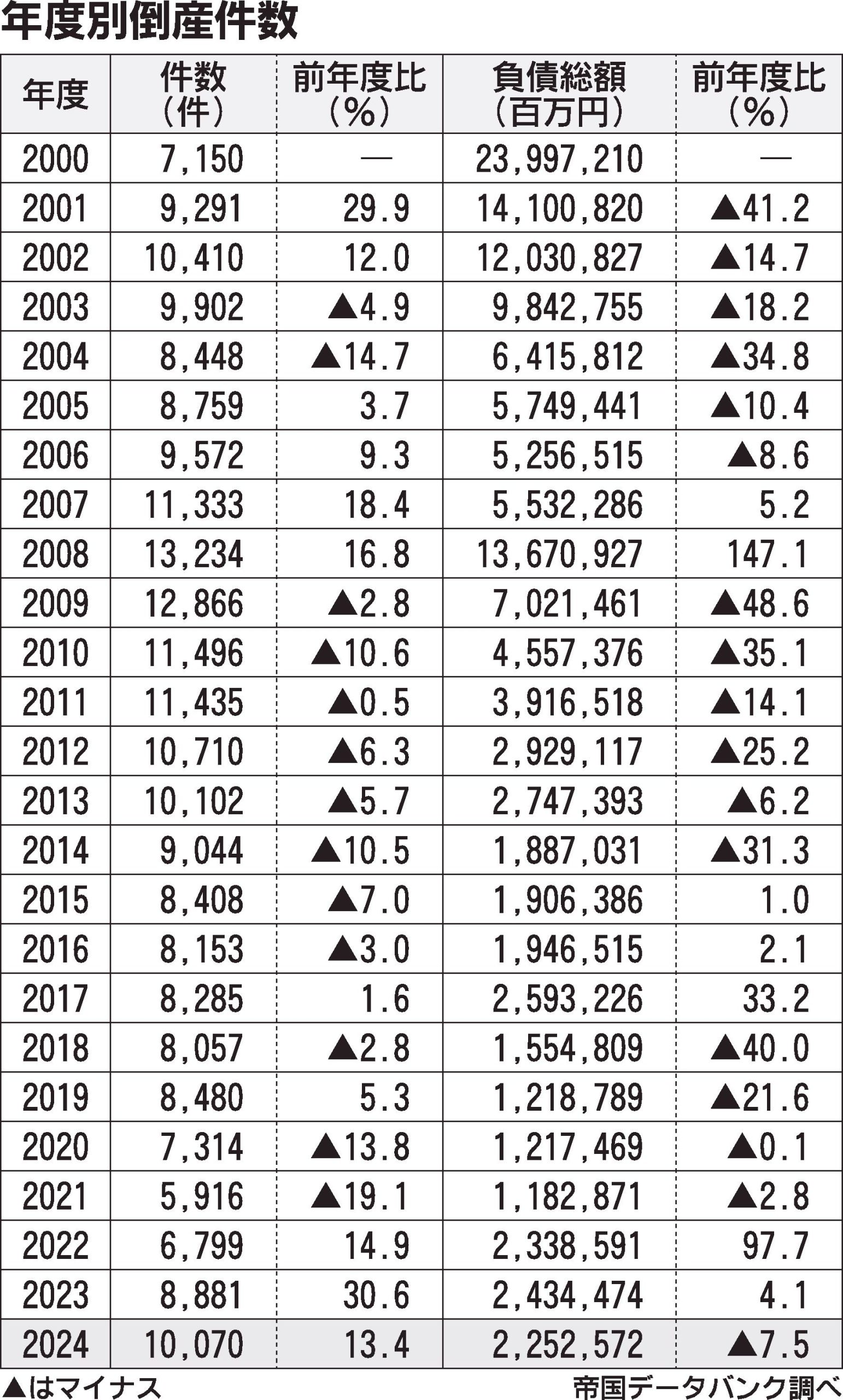 2024年度の企業倒産が11年ぶりに1万件を超えたことが、帝国データバンクと東京商工リサーチの調査でわかった。負債総額は両社の調査ともに2兆円を超えた。製造業では人手不足に加え、原材料や資材、エネルギー価格の高騰分の価格転嫁の遅れなどが倒...