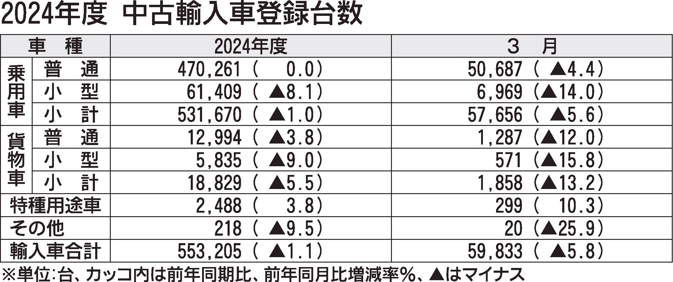 日本自動車輸入組合(JAIA、ゲルティンガー剛理事長)が10日発表した2024年度の中古輸入車登録台数は前年比1.1%減の55万3205台となり、2年ぶりに減少した。一部の輸入車ブランドで海上輸送の制約などにより、新車販売が減少。顧客への納車が遅れたことで、下取り車や買い取り車の発生も減り、小売り車両が不足したことが一因とみられる。