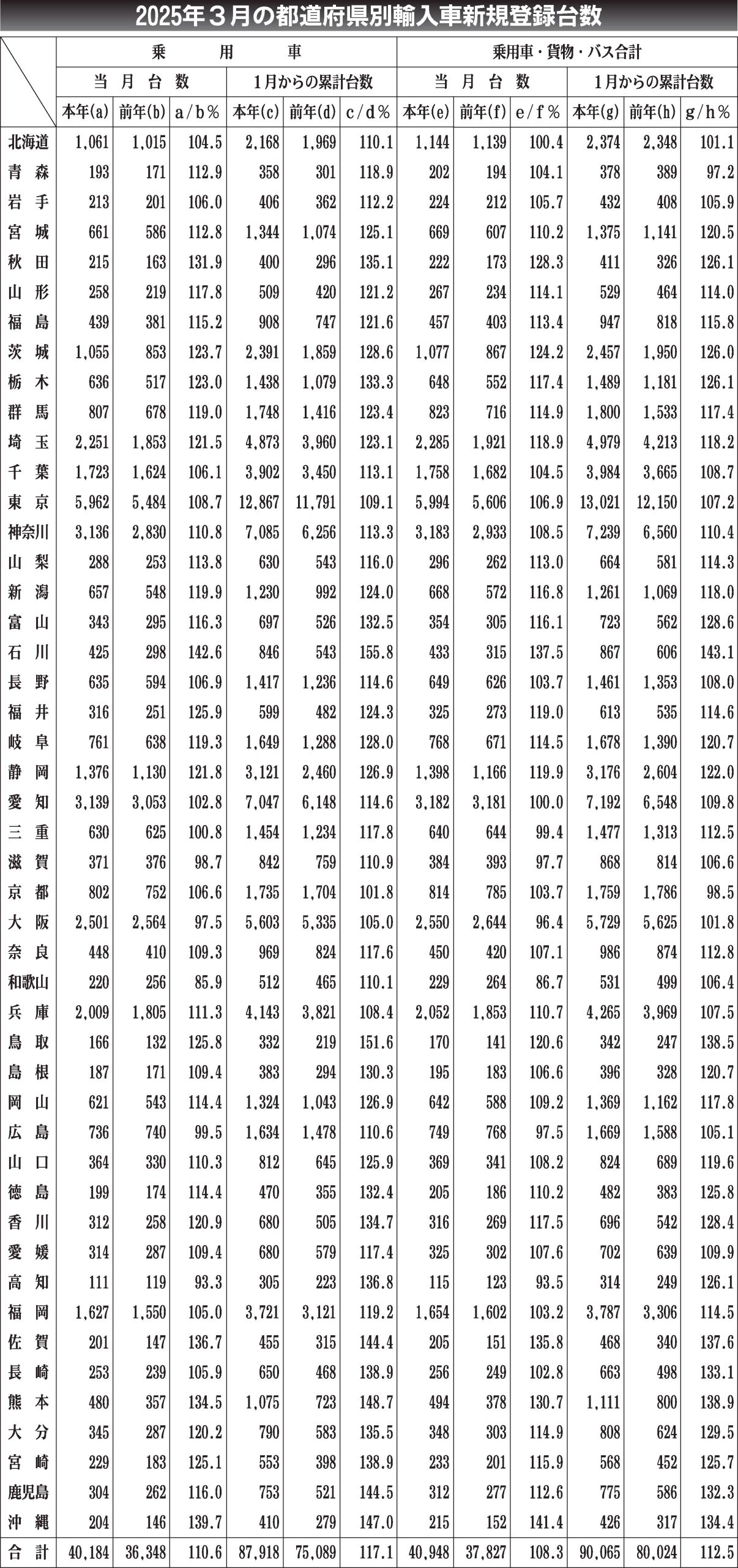 〈2025年3月の都道府県別輸入車新規登録台数〉