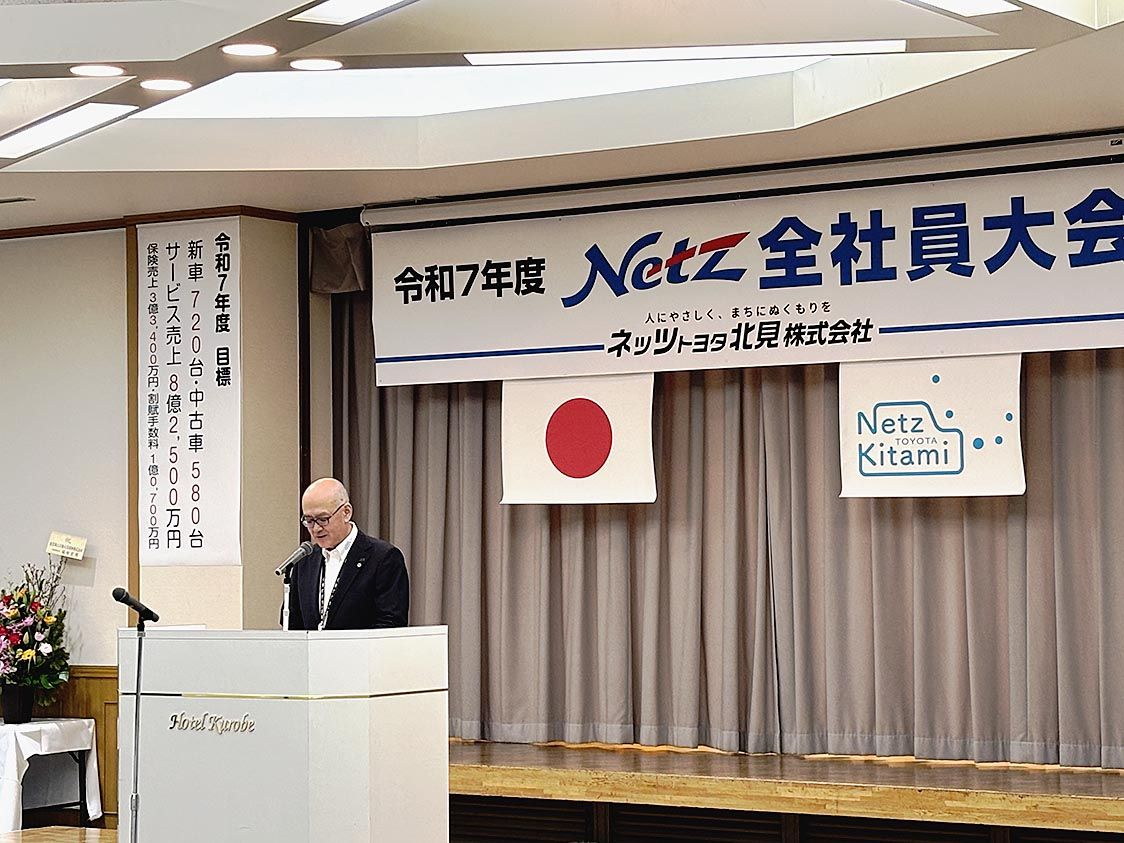 【北見】ネッツトヨタ北見(河合昭徳社長)は「令和7年度全社員大会」を市内のホテルで開催した。2025年度の経営計画などを発表し、全社員で目標達成に向けた士気を高めた。 全社員と来賓合わせて106人が出席。冒頭の挨拶で河合社長は、今年度の方...
