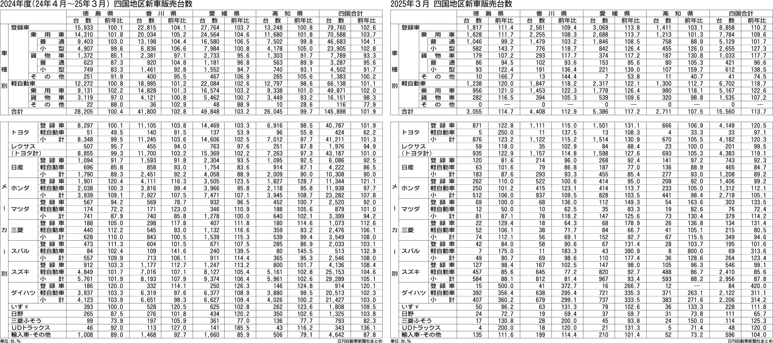 四国地区の2024年度(4月~25年3月)の新車販売台数(登録車+軽自動車)は前年度比1.9%増の14万5898台と3年連続で増加した。上期(4~9月)は前年同期比2.9%減の6万8347台と一部メーカーの認証不正問題などに伴う新車の出荷...