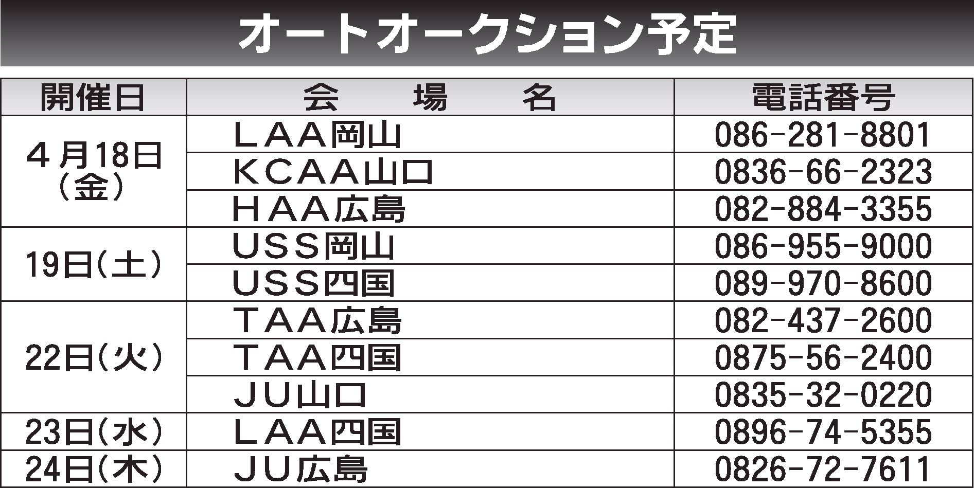 〈オートオークション予定〉中四国地区 2025/4/18~24
