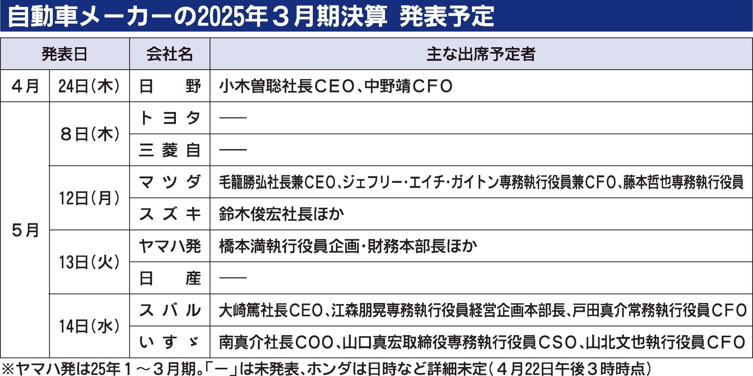 〈主な部品メーカーの2025年3月期決算発表日(4月18日時点)〉