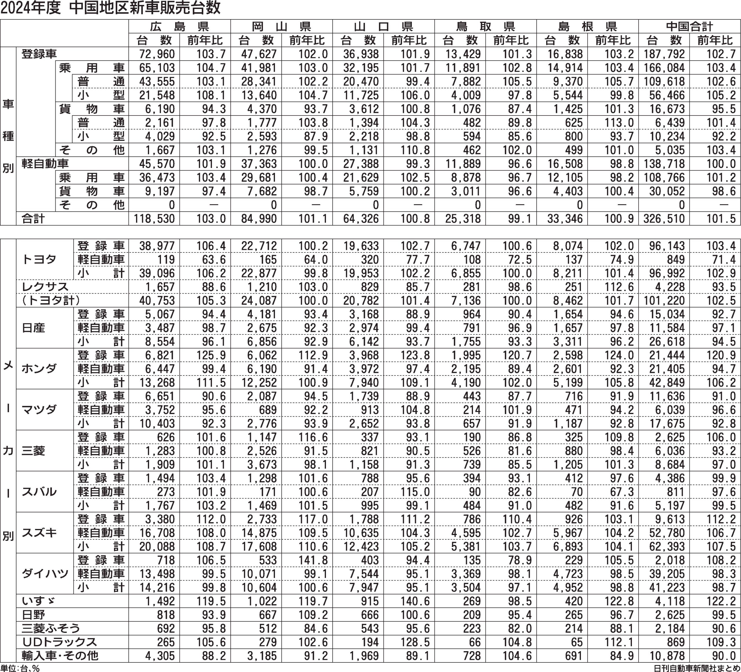 2024年度(24年4~25年3月)の中国地区新車販売台数(登録車と軽自動車の合計)は、前年度比1.5%増の32万6510台となった。メーカーによる型式認証不正による出荷停止が影響し、上期が前年を4.3%下回ったが、下期は生産が回復基調で...