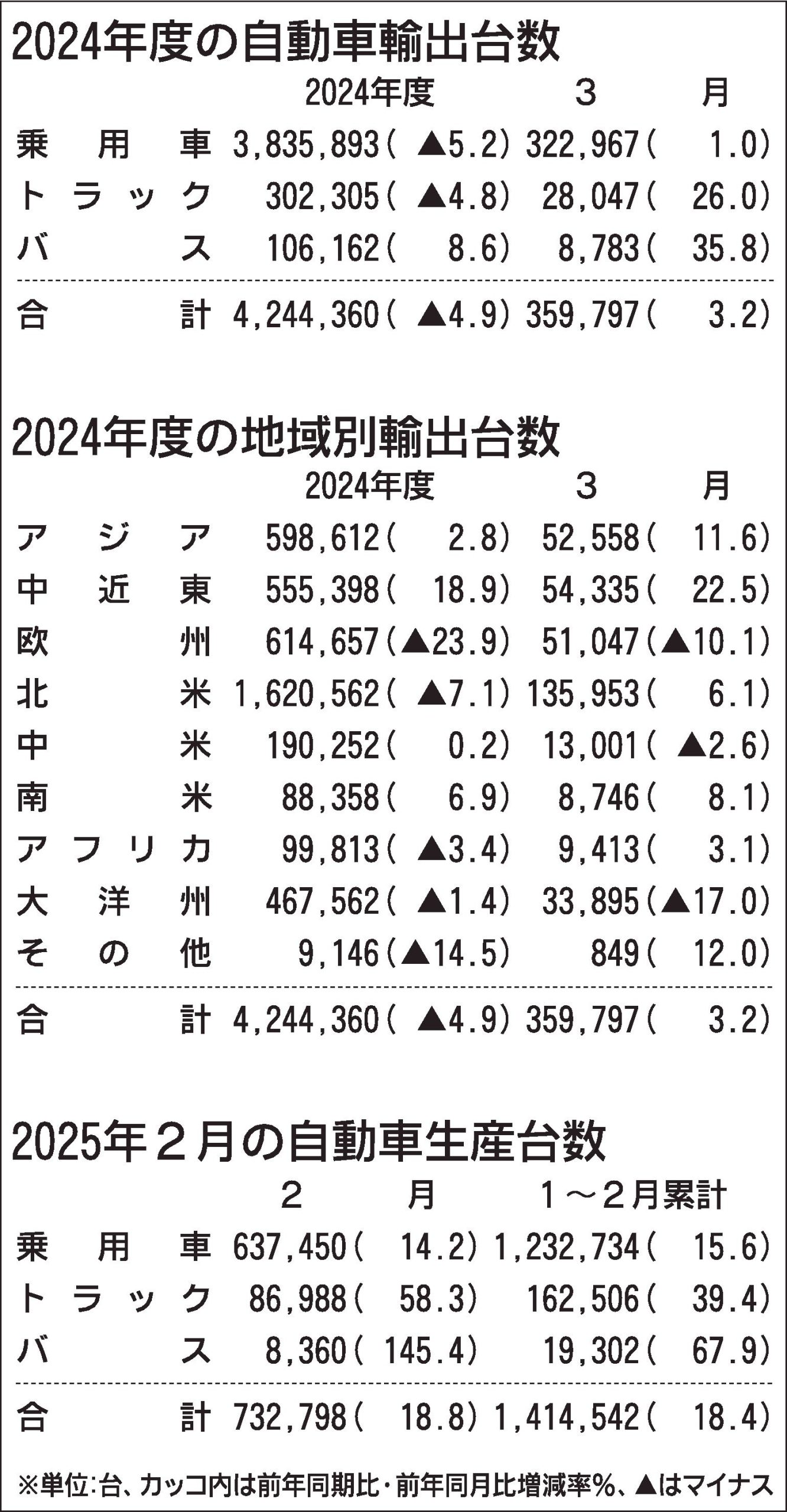 最大の仕向け地である北米は同7.1%減の162万台だった。ただ、米国向けの3月の実績は11万5千台と、同6.1%増加した。トランプ米政権は4月3日、日本を含めた自動車への25%の追加関税を発動した。このため各社が直前で輸出を増やしたことが分かる。ホンダや日産自動車など、現地生産を増やす動きもあり、今後の輸出動向が注目される。