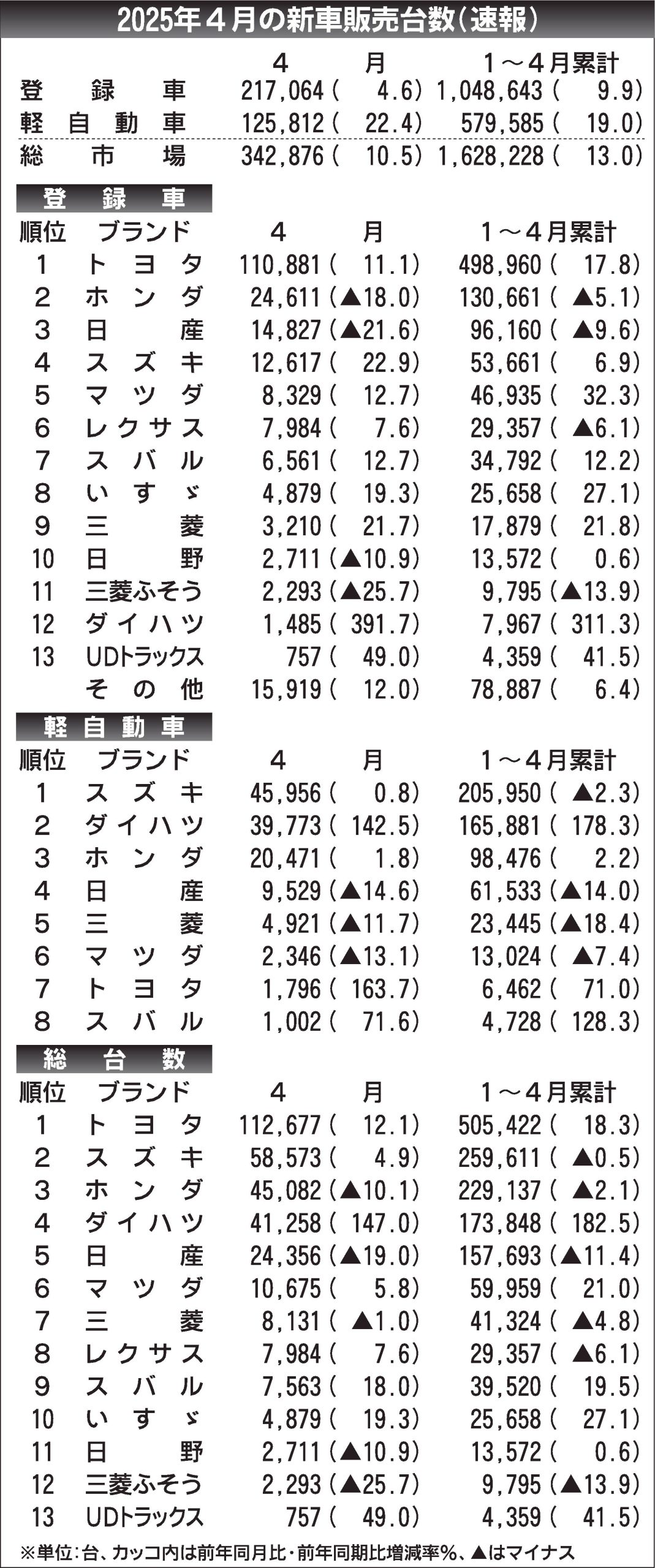 2025年4月の国内新車販売、4カ月連続プラス 前年の出荷停止の反動増 一昨年の水準には届かず