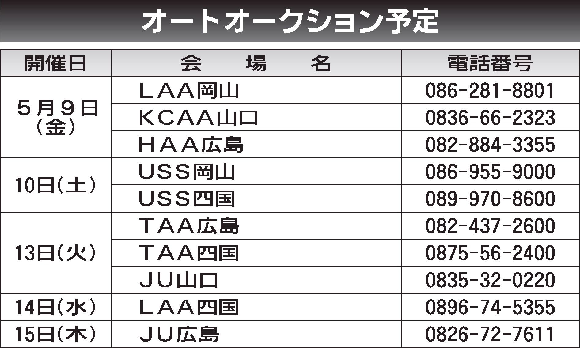 〈オートオークション予定〉中四国地区 2025/5/9~15
