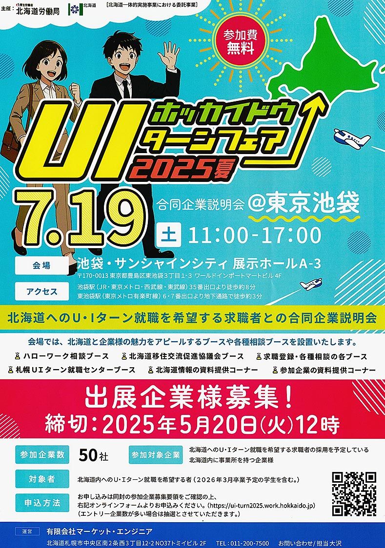 厚生労働省北海道労働局と北海道は、道外在住者対象の合同企業説明会「北海道U・Iターンフェア2025」を7月19日に東京都内で開く。5月20日まで出展希望企業を受け付けており、募集枠は50社。前年開催は求職者97人が参加し、10人の採用が決...
